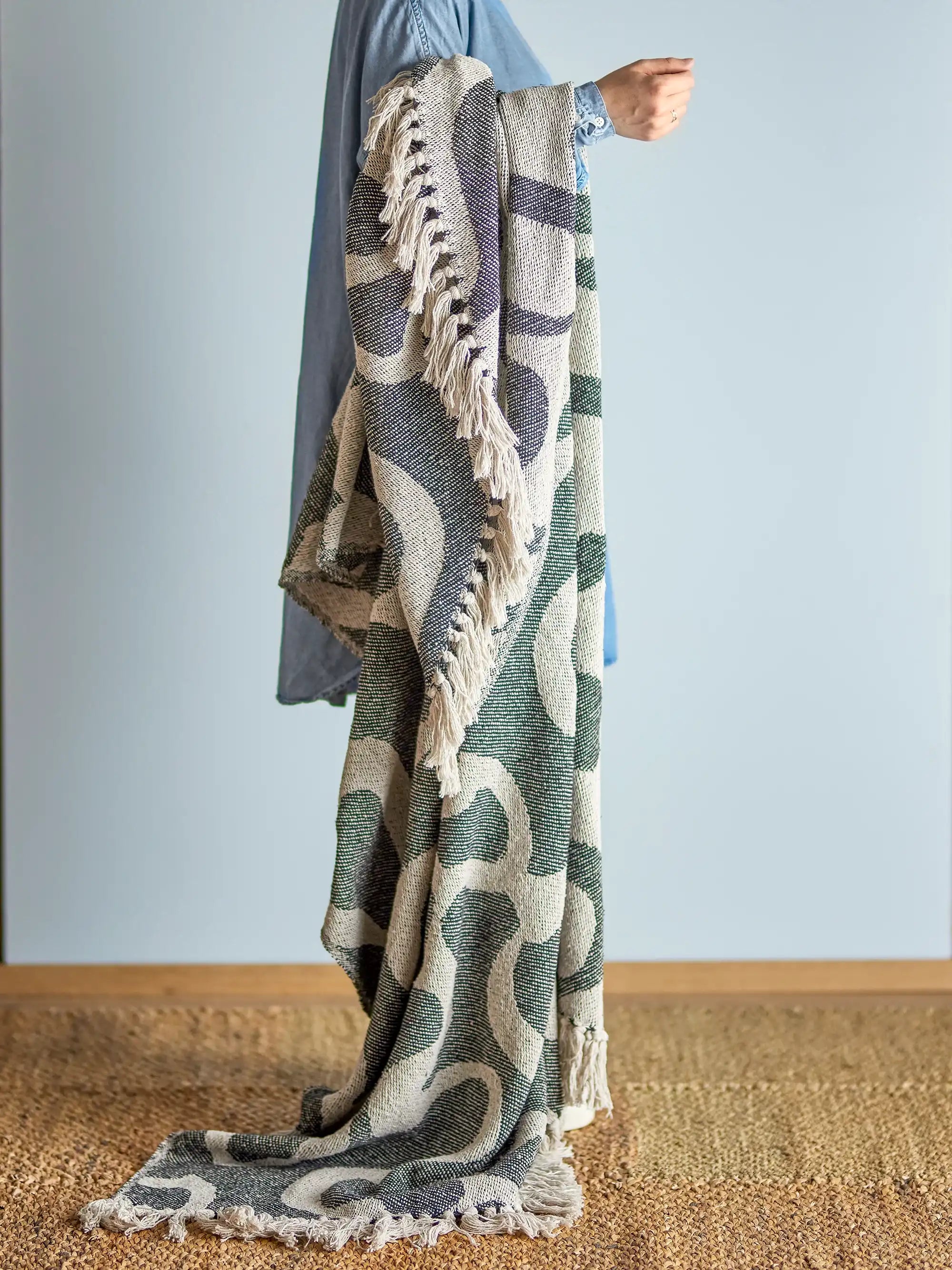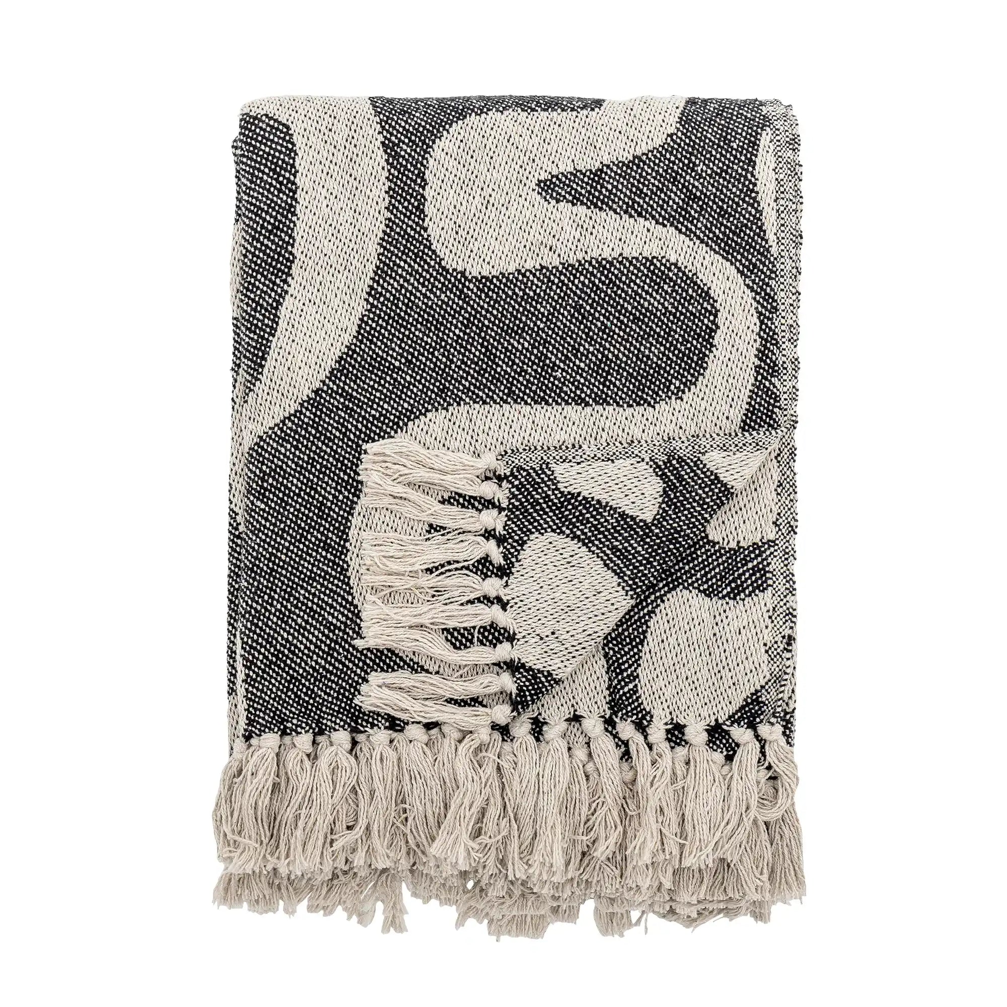 Details & materiaal: Deze royale plaid (130x160 cm) is geweven van gerecycled katoen en heeft een uniek organisch patroon in zwart met beige tinten. De speelse franjes geven het geheel een casual Scandinavische uitstraling en benadrukken het duurzame karakter van het materiaal.