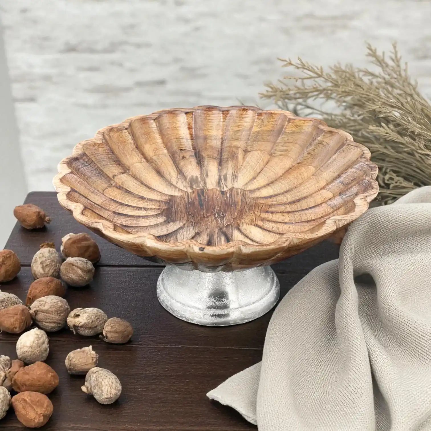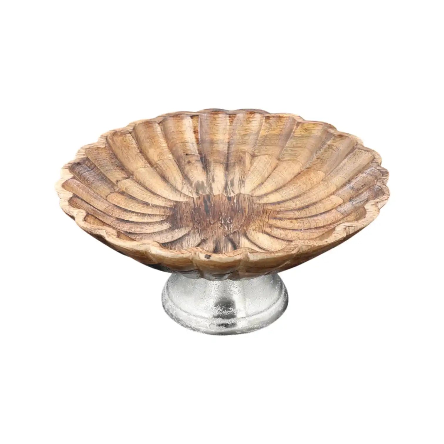 Het Plateau Niederau van 25 cm is een prachtig samenspel van natuurlijke materialen en verfijnd design. De handgesneden houten schaal met subtiel bloemvormig reliëf rust op een stevige, zilverkleurige aluminium voet. Deze combinatie van warm hout en glanzend metaal zorgt voor een elegant contrast dat moeiteloos past binnen een modern landelijk of industrieel interieur.