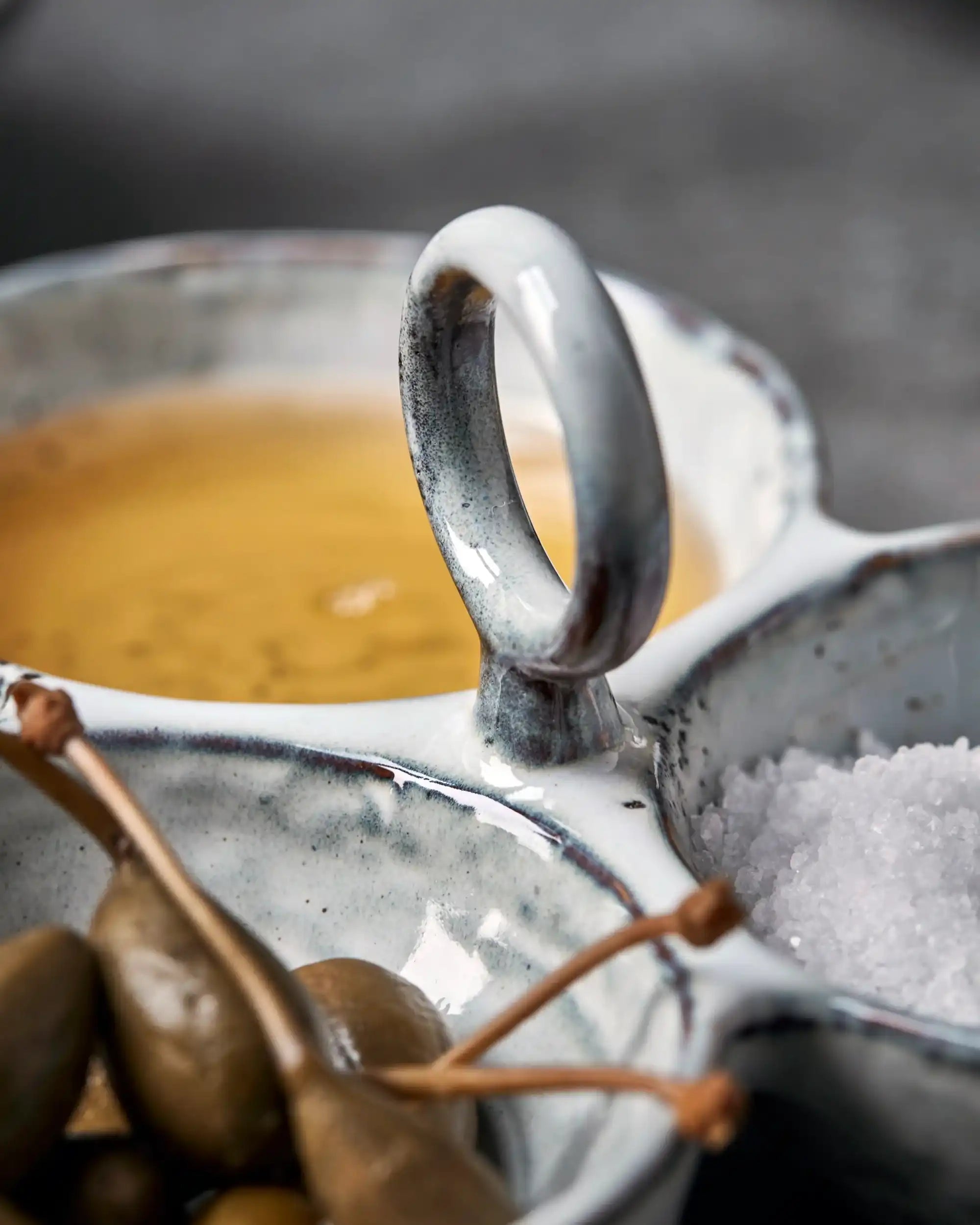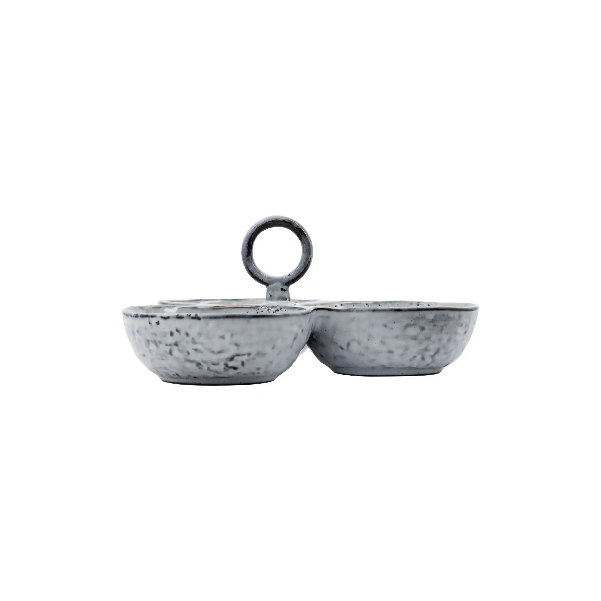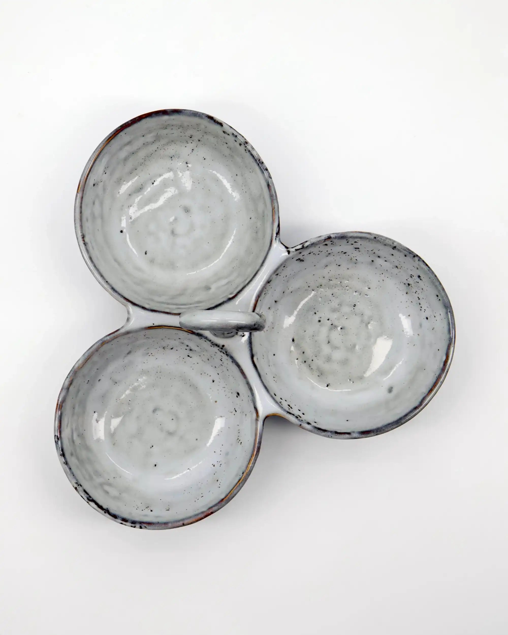Het ontwerp bestaat uit drie aaneengeschakelde schaaltjes van aardewerk, afgewerkt met een reactieve glazuur. Elke schaal toont subtiele variaties in kleur, van koelgrijs tot blauwgrijs, die elke set uniek maken. De ronde vormen en het geïntegreerde handvat in het midden zorgen voor een praktische én sfeervolle toevoeging aan je tafel. Afmetingen: 20 cm lang, 20 cm breed en 9 cm hoog.