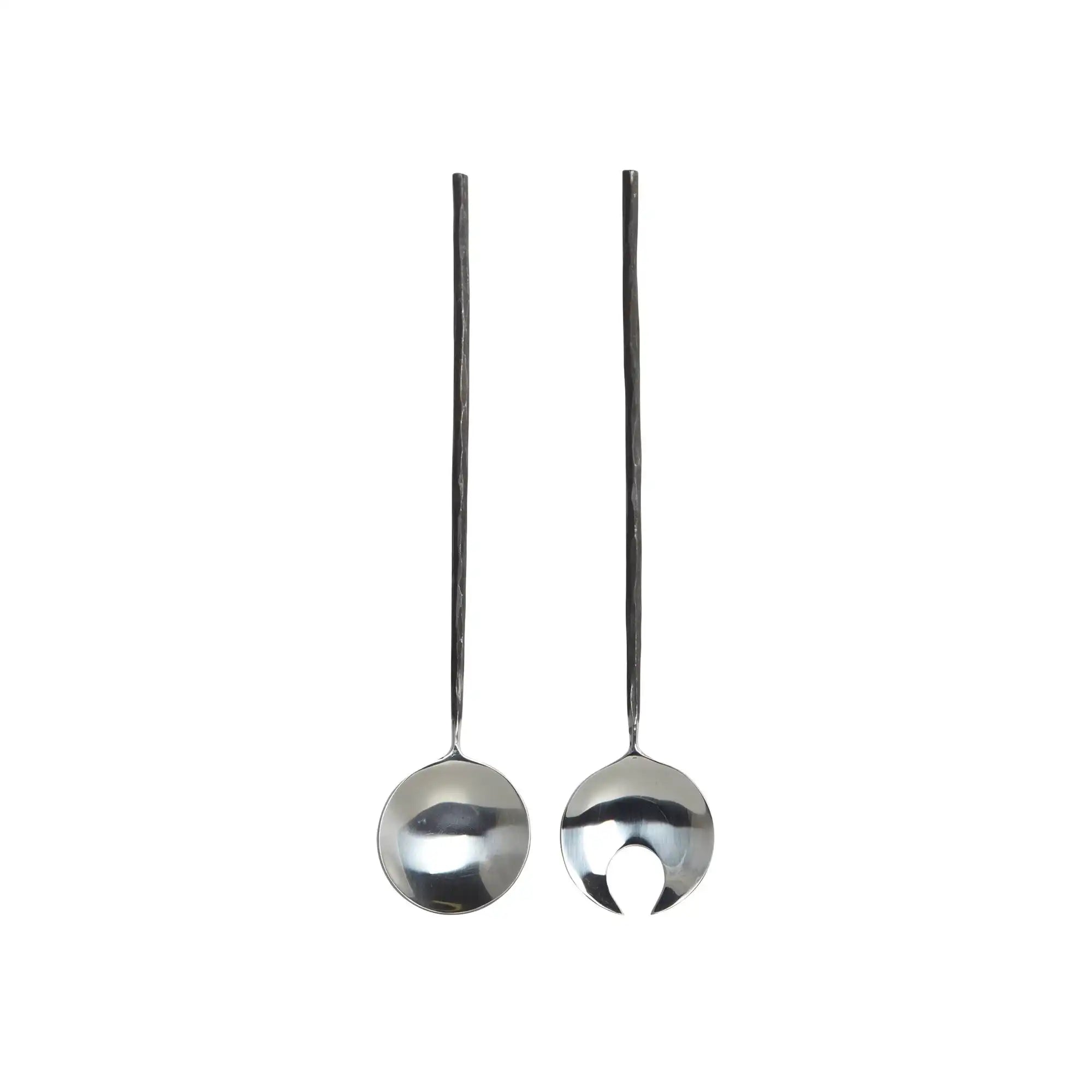 De serveerset is gemaakt van hoogwaardig rvs en uitgevoerd in een combinatie van zwart en zilver. De lepel en vork zijn elk 30 cm lang en 7 cm breed – ideaal om comfortabel te hanteren en royaal te serveren. Het minimalistische ontwerp met rustieke accenten maakt deze set een mooie aanvulling bij keramiek of strak servies.