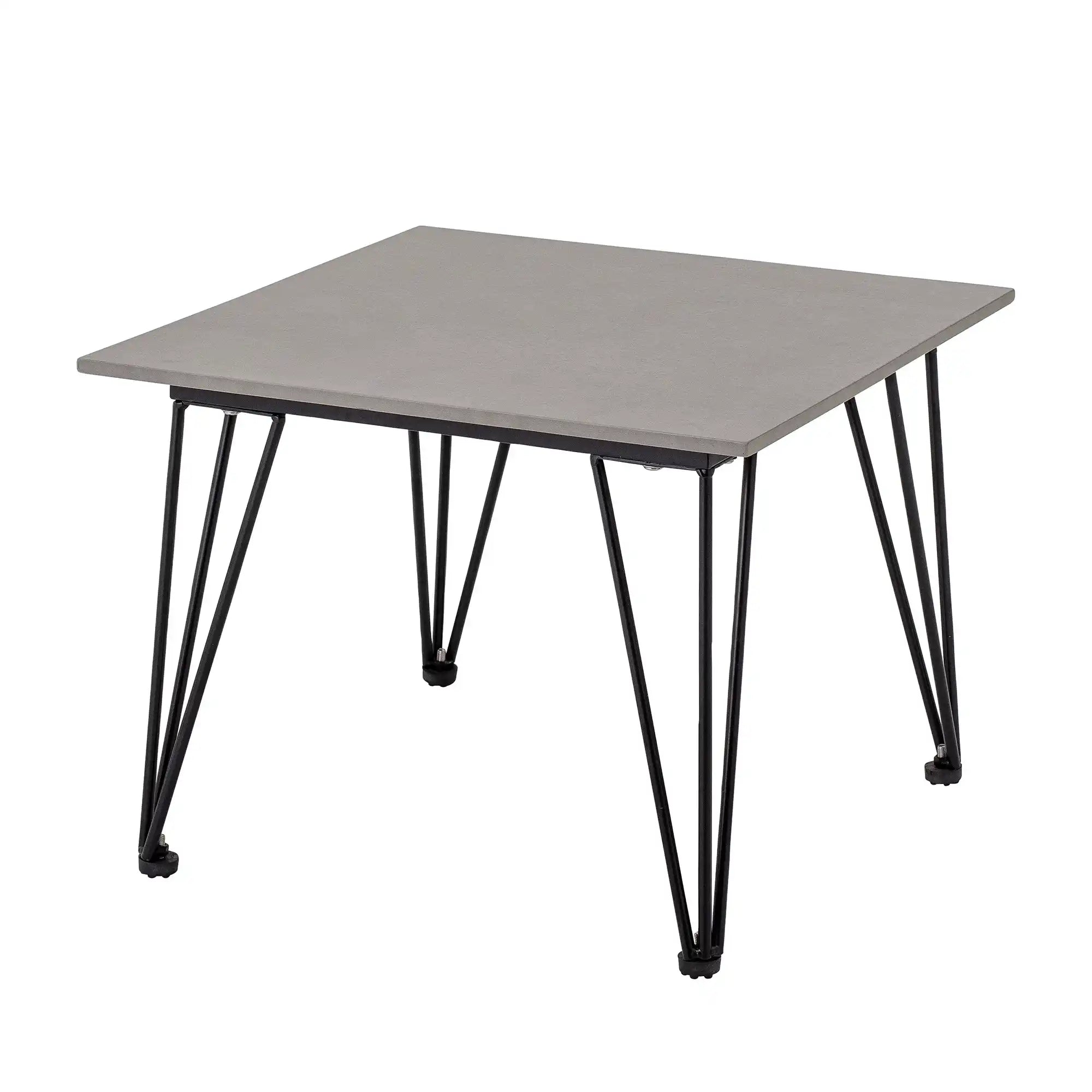 Het stevige blad is vervaardigd uit grijs vezelcement, wat niet alleen een stoere, robuuste uitstraling geeft, maar ook weerbestendig en onderhoudsvriendelijk is. De slanke, zwarte metalen poten zorgen voor een elegant contrast en maken de tafel verrassend licht van gewicht. Met een vierkant blad van 55 x 55 cm en een hoogte van 42 cm is de Mundoideaal als bijzettafel naast je loungeset, als centraal punt tussen tuinstoelen of zelfs als stijlvol accent in je woonkamer.