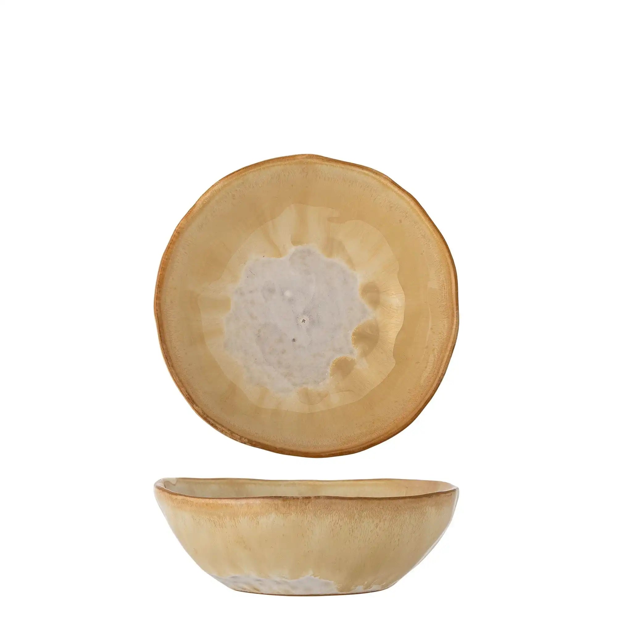 Details & materiaal: Gemaakt van aardewerk in een beige/naturel kleurstelling, afgewerkt met een reactief glazuur dat diepte en textuur geeft. De schaal heeft een handig formaat van ø 13 cm, prettig voor snacks, dips of als sierkom. De organische tekening van het glazuur sluit moeiteloos aan bij andere aardewerken items en laat je tafeldekking tot leven komen. Elk stuk bezit een eigen, subtiel variërende uitstraling die je collectie karakter geeft.