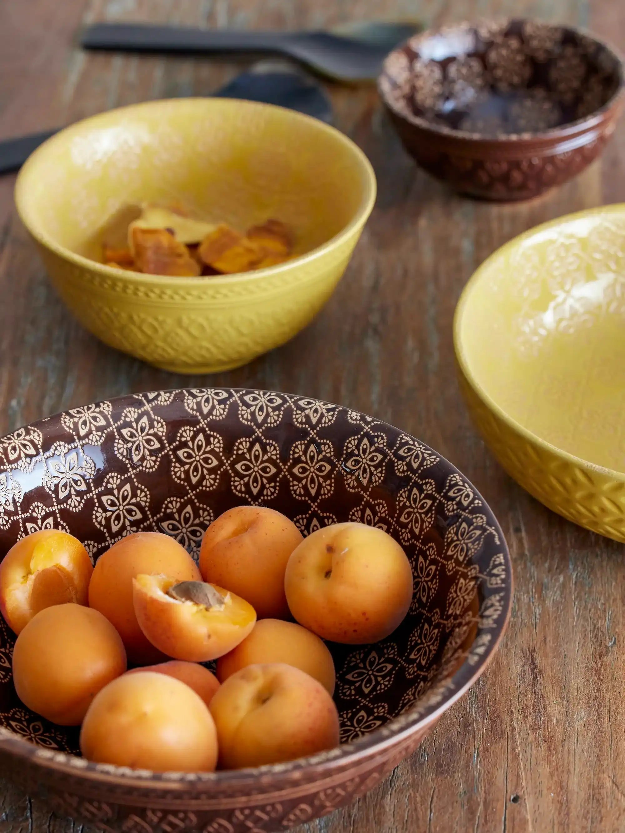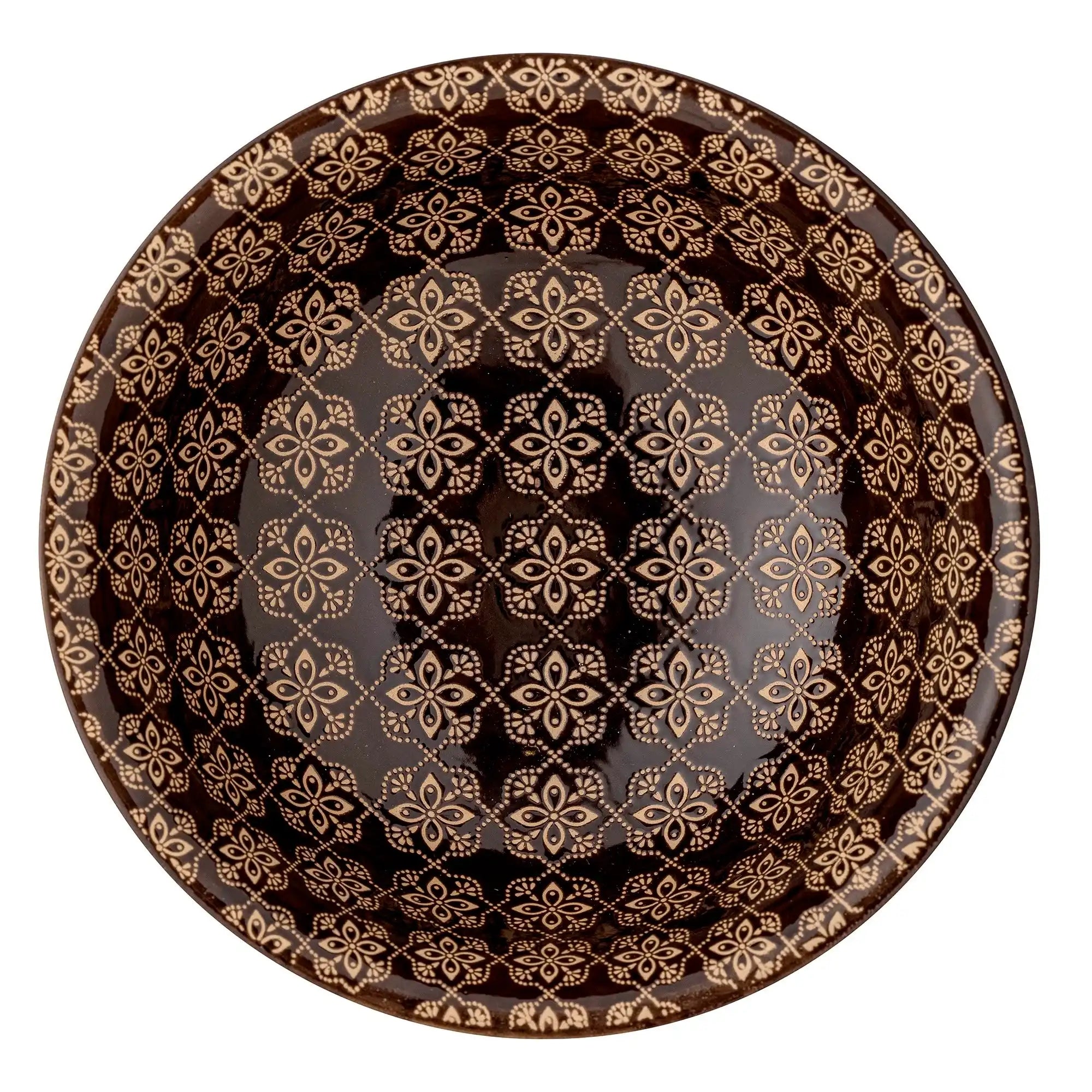 Details & materiaal: De schaal is gemaakt van aardewerk en voorzien van een glazuurlaag met kleine, ingedrukte bloemetjes. De diepe bruine tint krijgt zo een mooie diepte en een rustig, tactiel karakter. Met ø 21 cm biedt de Marsala precies het juiste formaat voor salades, soepen of een royale yoghurtbowl. Het solide aardewerk voelt prettig in de hand en laat je tafel er verzorgd uitzien, of je nu solo serveert of combineert met ander servies.