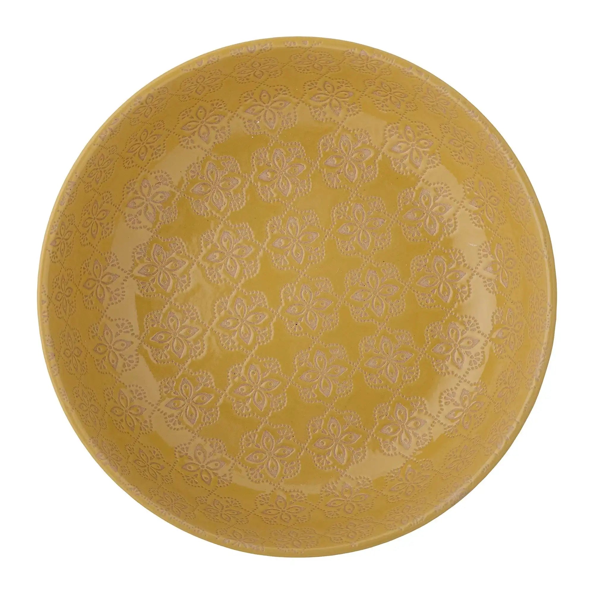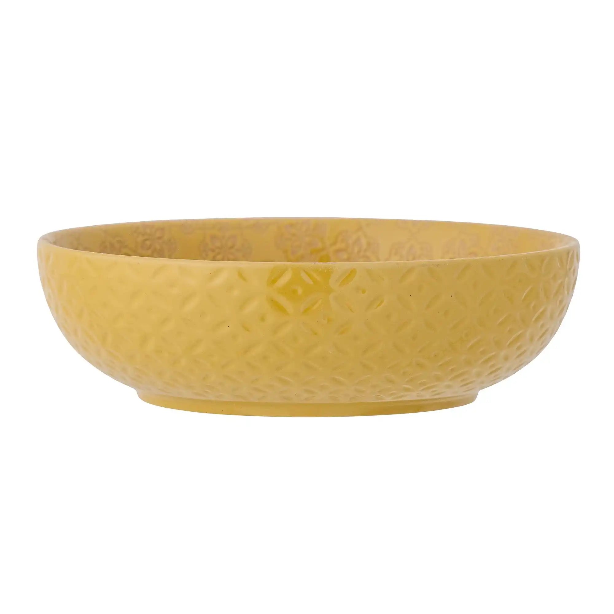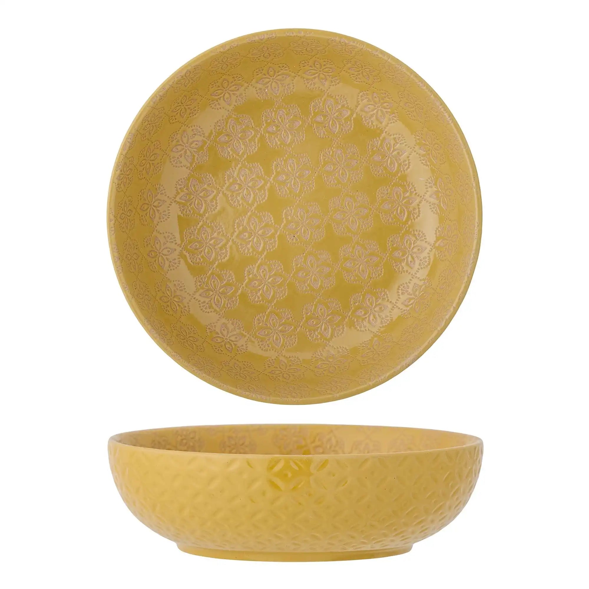 Details & materiaal: Gemaakt van aardewerk en uitgevoerd in een warme gele kleur, combineert de schaal een gladde glans met fijn reliëf. De maatvoering van ø 20 cm biedt precies de ruimte die je nodig hebt voor bowls, bijgerechten of kleinere porties. De rand loopt comfortabel rond, waardoor opscheppen en eten prettig aanvoelt. De subtiele bloemen in het glazuur geven textuur zonder te overdrijven, zodat je gerechten visueel de hoofdrol houden.