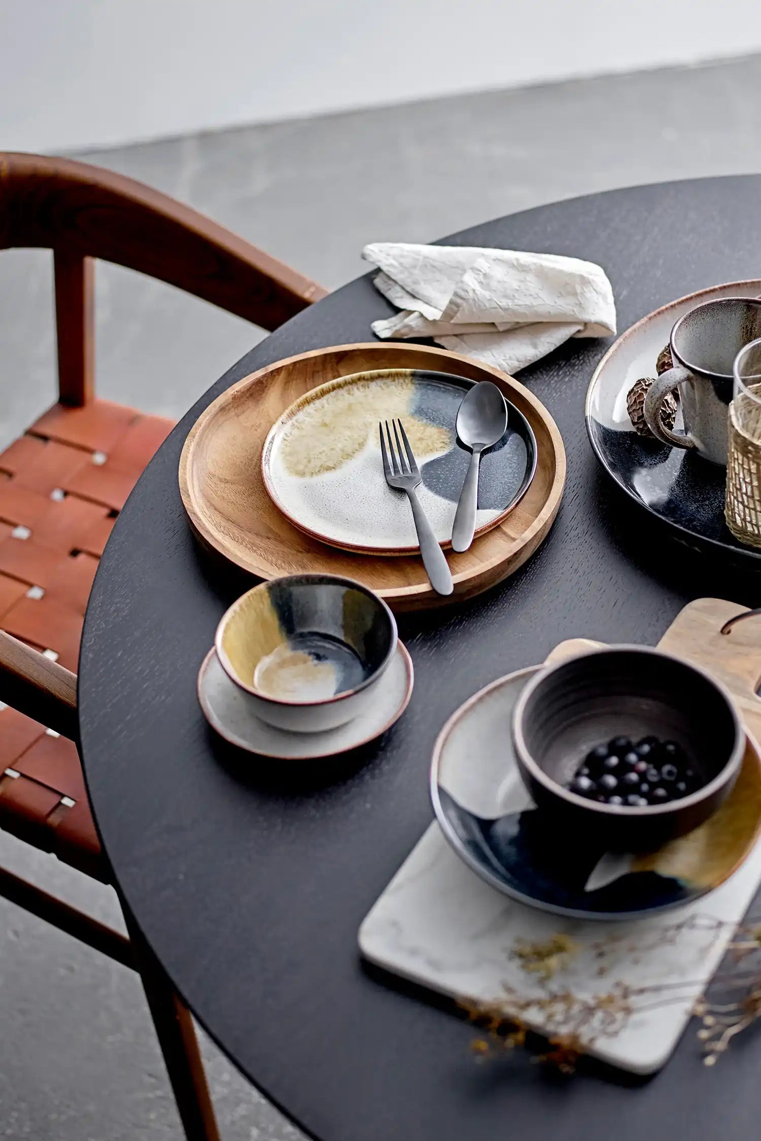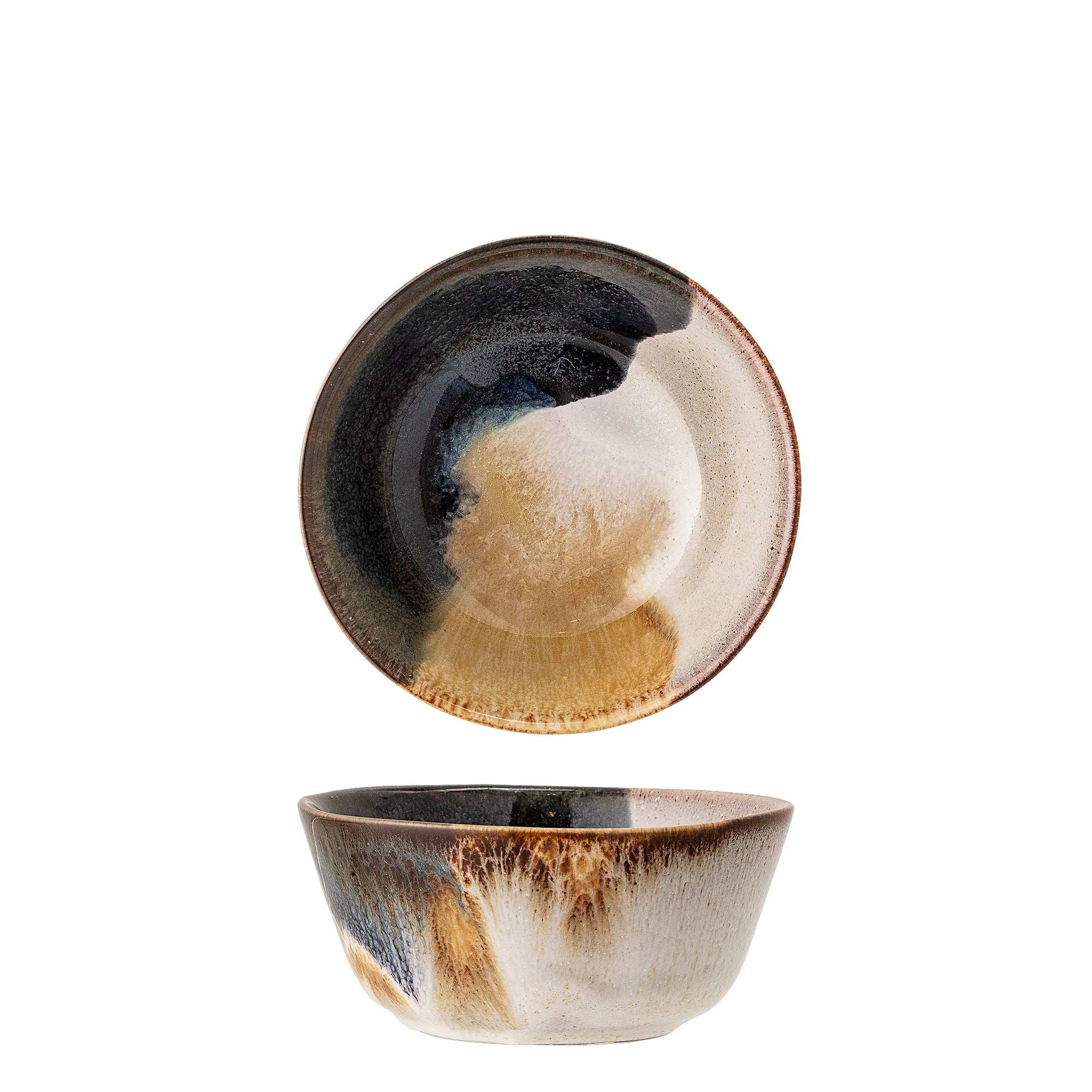 Details & materiaal: De schaal is met de hand vervaardigd uit stevig aardewerk en afgewerkt met een unieke geglazuurde look in grijs, curry en diepblauw. Dankzij het formaat (13 cm doorsnee, 6 cm hoog) is hij perfect voor ontbijt, kleine salades of je favoriete bijgerechten. Bovendien kun je rekenen op makkelijk onderhoud, want de schaal is geschikt voor zowel de vaatwasser als de magnetron.