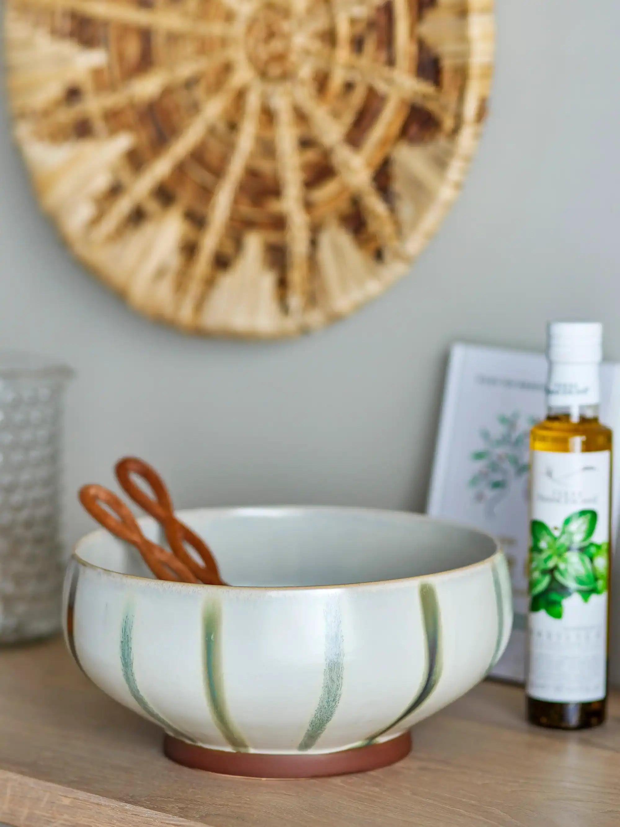 Details & materiaal: De schaal is met zorg vervaardigd uit stevig aardewerk en uitgevoerd in een zachte grijstint met subtiele groene strepen. Met zijn royale diameter van 25,5 cm en hoogte van 12 cm is hij ideaal als fruitschaal, centerpiece of decoratief object op je eettafel. Het hoogwaardige materiaal zorgt voor een luxe uitstraling én een lange levensduur.