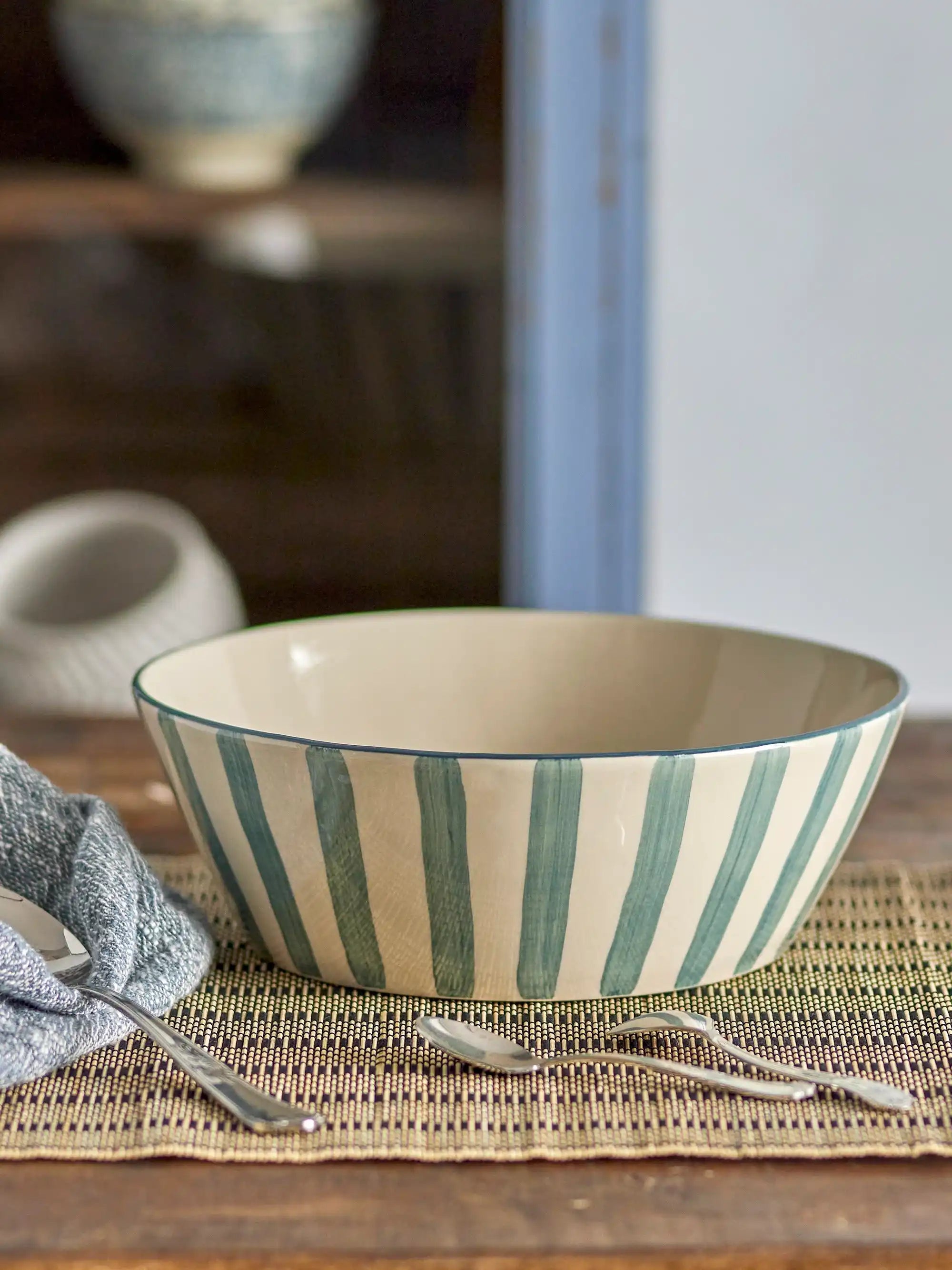 Details & materiaal: Gemaakt van aardewerk met ø 23,5 cm. De schaal heeft een groene basis met een handbeschilderd gestreept patroon in blauw; daardoor is ieder exemplaar uniek. Het formaat biedt ruimte voor salades, fruit of decoratieve objecten. De handgeschilderde strepen geven diepte en levendigheid, waardoor de schaal ook zonder inhoud tot haar recht komt. Dat veelzijdige ontwerp maakt haar net zo functioneel als decoratief.