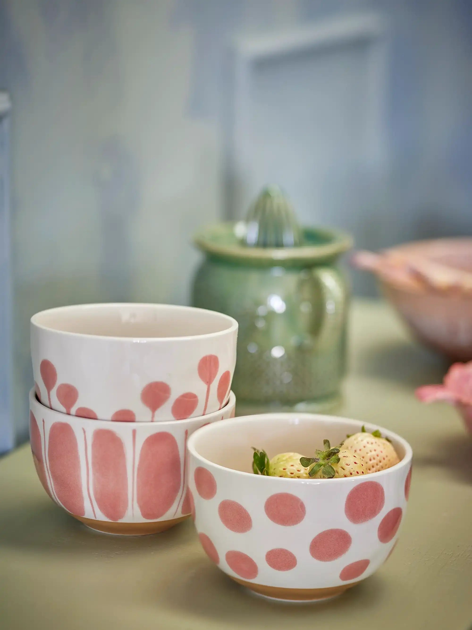 Details & materiaal: Gemaakt van aardewerk en afgewerkt met een glazuurlaag die de penseelstreken mooi verdiept. Met ø 12,5 cm heeft de Linora het perfecte formaat voor tapas, dips of een stilleven van kleine accessoires. De kleur roze oogt warm en verfijnd; in combinatie met de afgeronde vorm ontstaat een harmonisch geheel dat moeiteloos mixt met andere items. Elk item is met de hand geschilderd, waardoor kleine verschillen in kleur en toepassing mogelijk zijn – precies wat deze schaal zo bijzonder maakt.