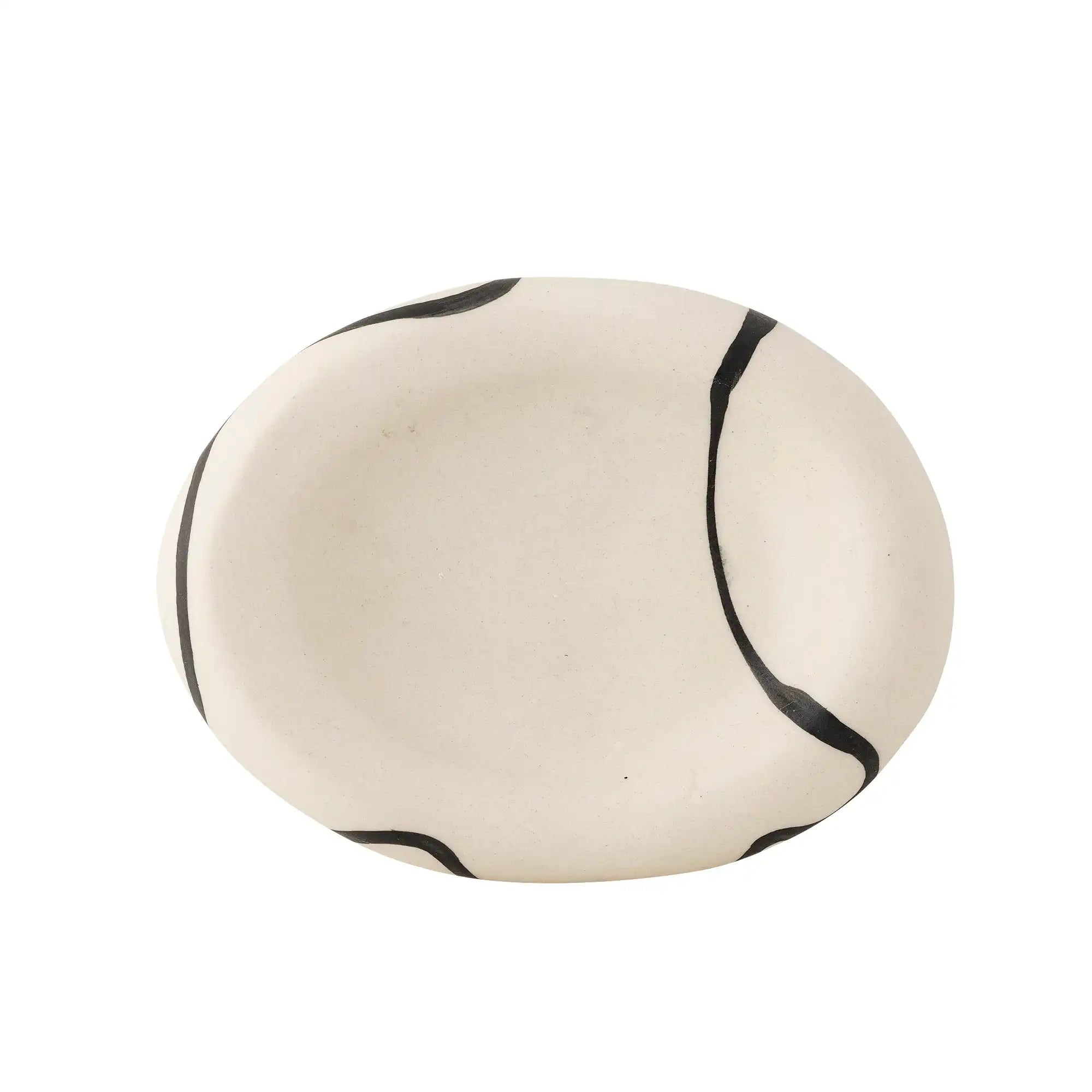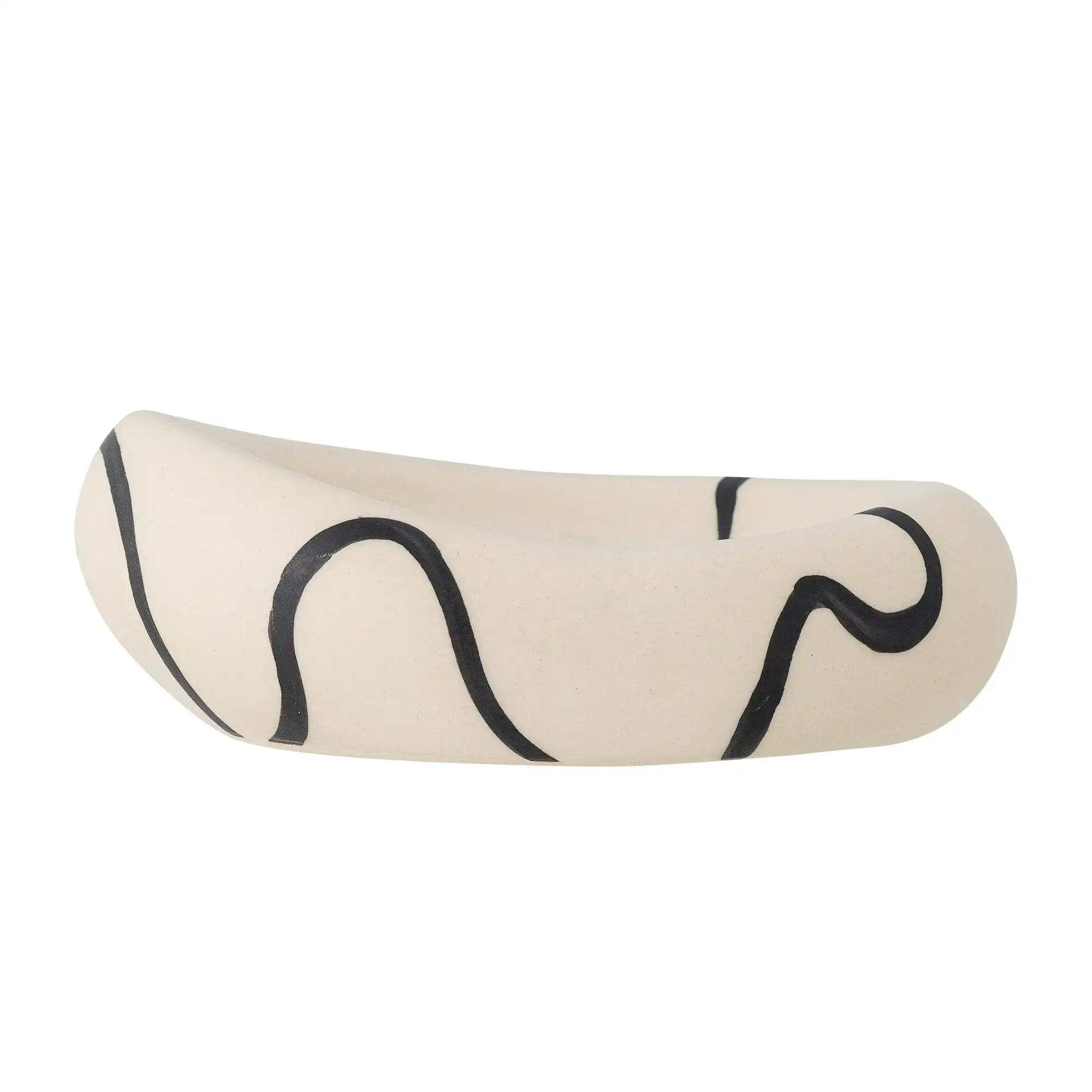 Verfijnde details & materiaal: Deze schaal is vervaardigd uit stevig wit aardewerk dat prettig zwaar in de hand ligt en kwalitatief aanvoelt. Elk exemplaar is deels met de hand beschilderd, wat betekent dat geen twee kommen exact hetzelfde zijn – ieder stuk heeft zijn eigen karakter door de subtiele nuances in het zwarte patroon. Dankzij de compacte afmetingen (11 cm breed, 5 cm hoog, 14 cm diep) is de schaal verrassend veelzijdig in gebruik.