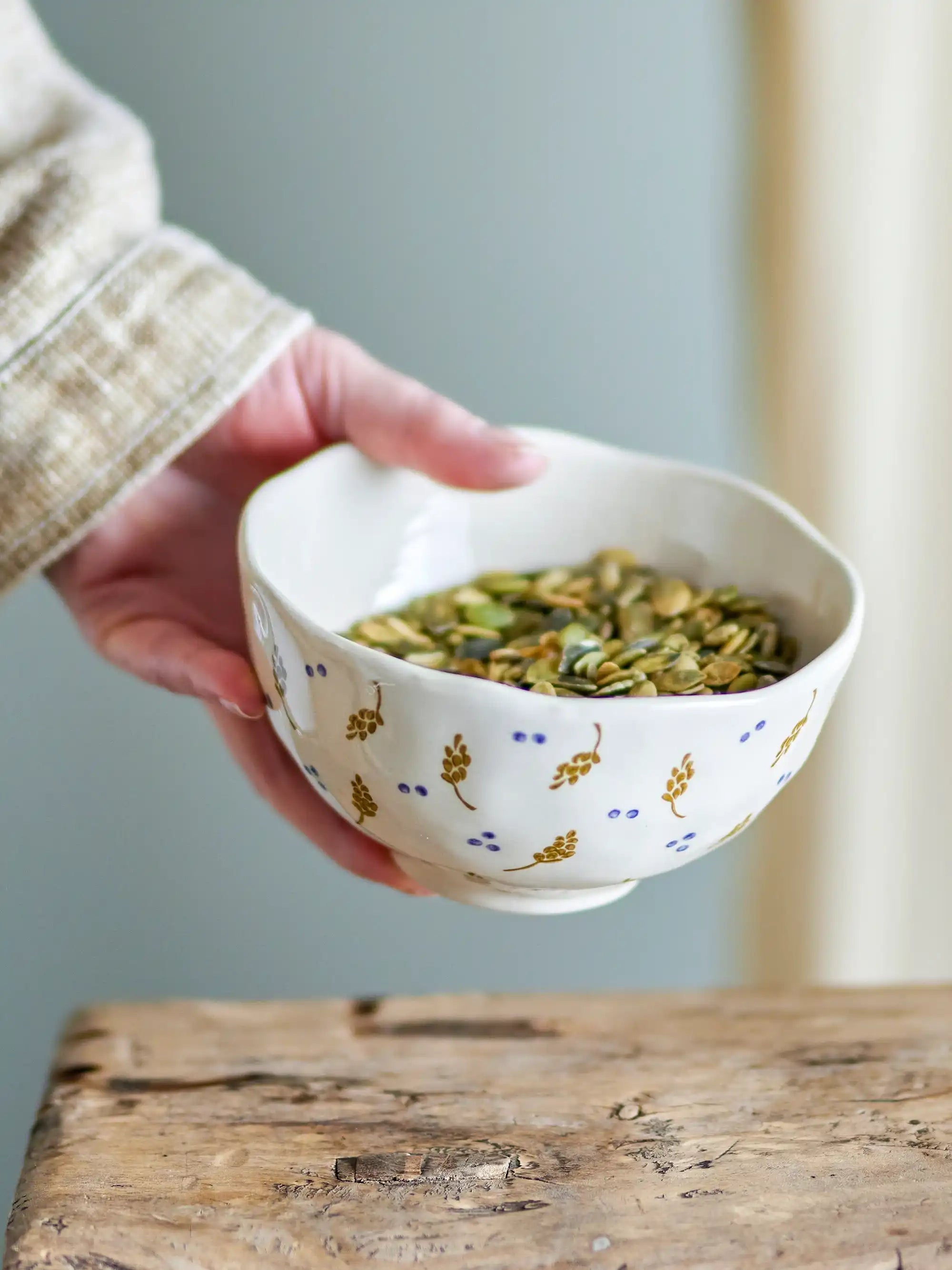 Details & materiaal: De schaal is vervaardigd van stevig wit aardewerk en afgewerkt met een glanzend glazuur. Met een diameter van 13 cm en een hoogte van 7 cm is ze perfect voor ontbijt, kleine salades of snacks. Dankzij het zorgvuldige ambacht is iedere schaal nét even anders, wat zorgt voor een charmant, speels effect op jouw eettafel.