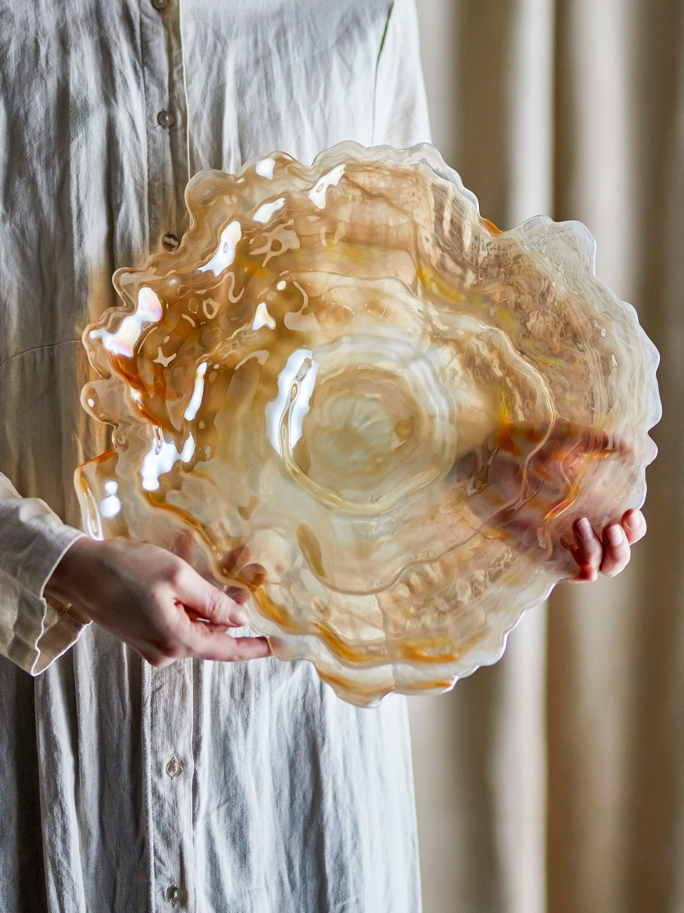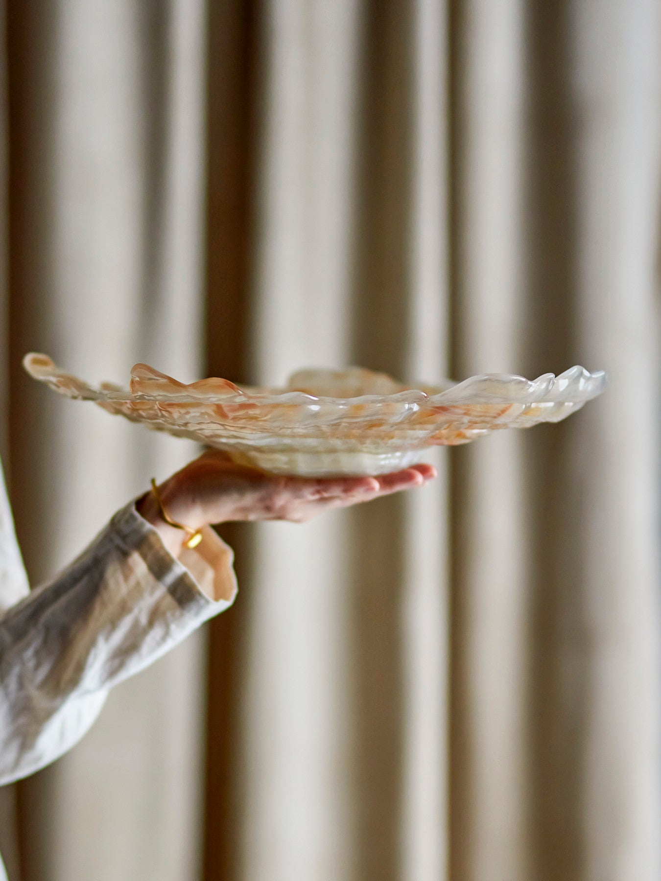 Gebruikstip: Combineer de schaal met linnen en aardewerk in verwante tinten voor een serene tafelsetting, of zet haar solo op een dressoir met enkele natuurlijke objecten. Varieer door de seizoenen: van een verzameling mooie vondsten tot een eenvoudig groen takje. Zo blijft Asimi telkens fris aanwezig, zonder te vragen om aandacht; een rustig accent dat je moeiteloos in huis haalt.