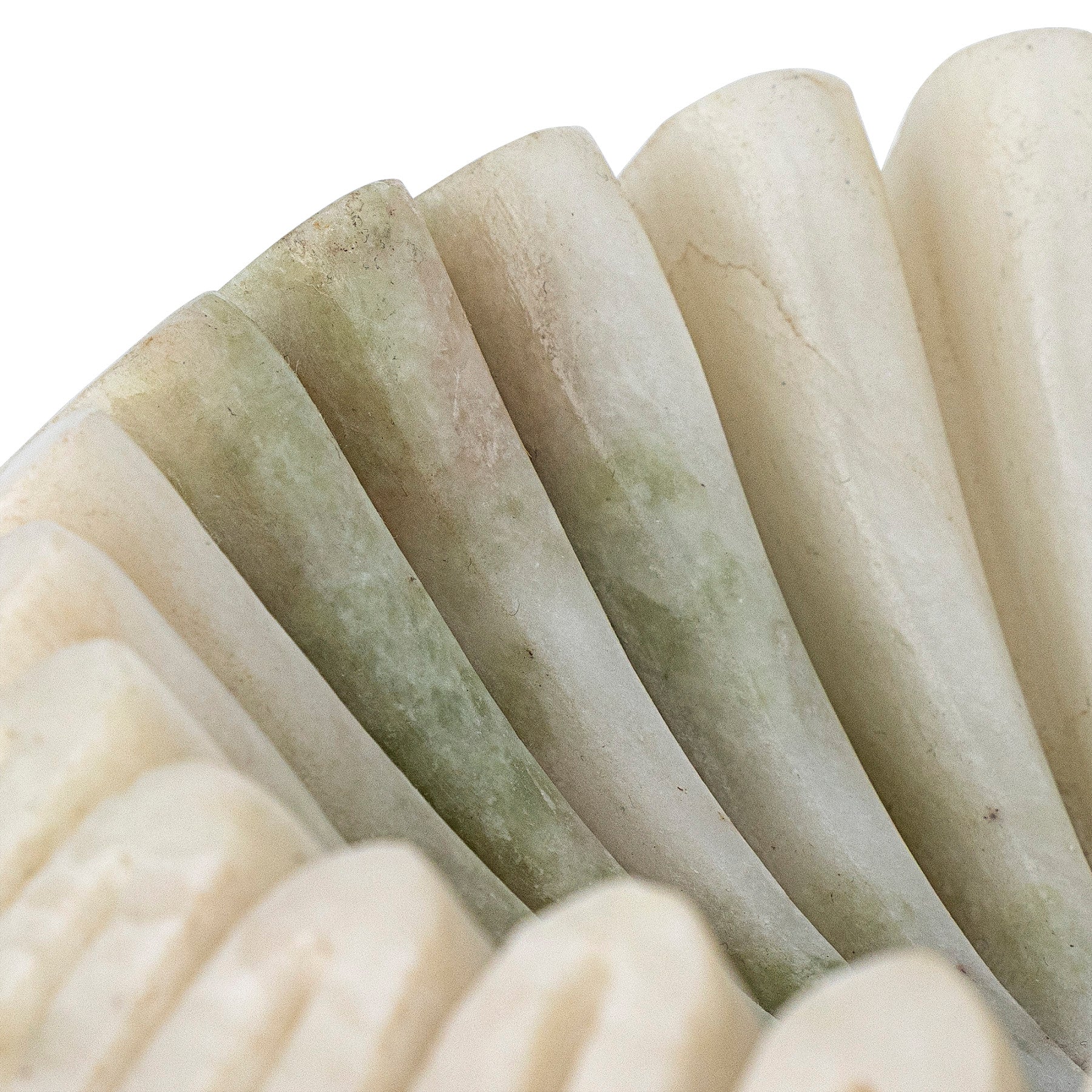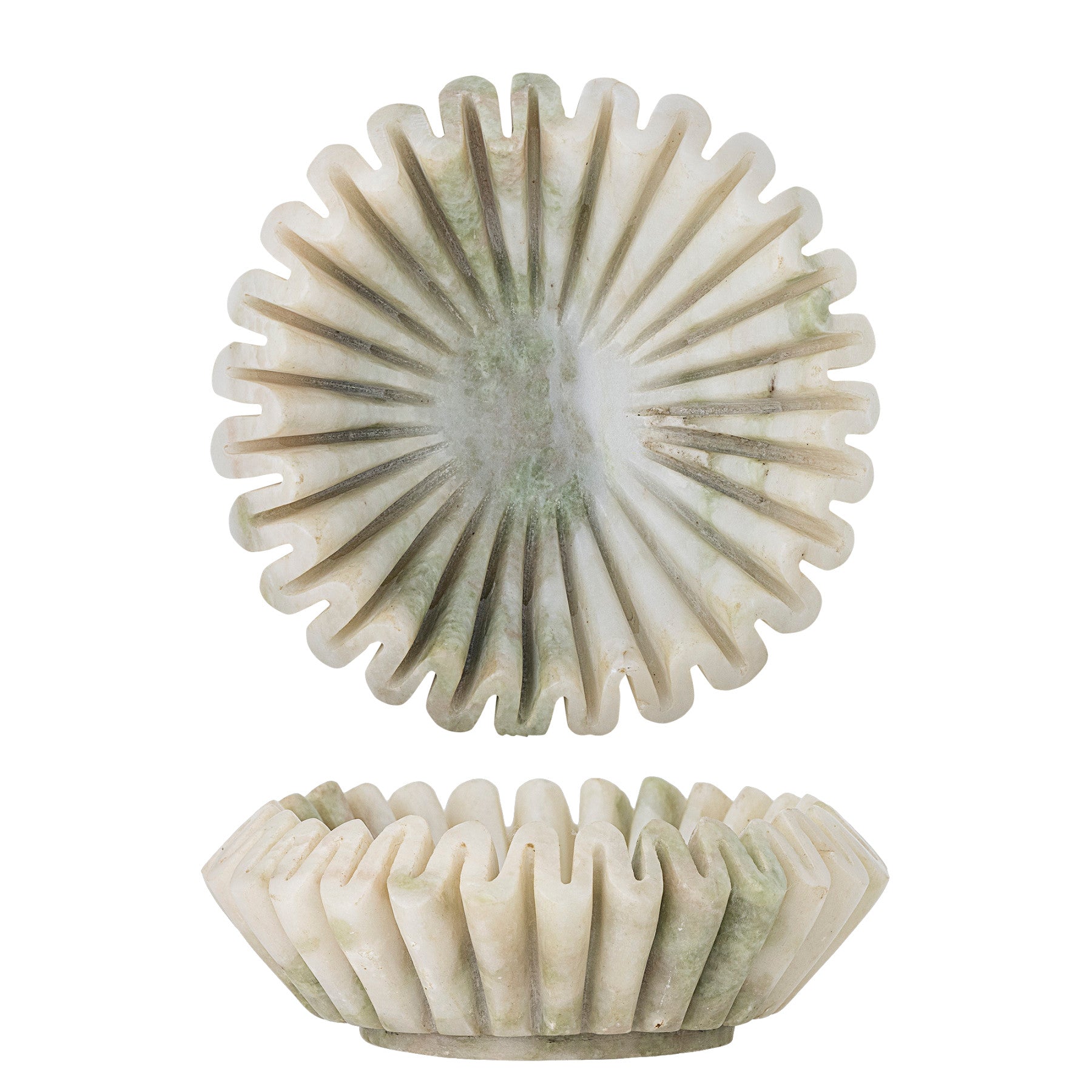 Details & materiaal: Gemaakt van marmer in groen met subtiele crème- en beige-aderen, en afgewerkt met een gepolijst oppervlak dat het licht zacht reflecteert. De geplooide randen versterken de vloeiende vorm en geven een luxe textuur. Met ø 17.5 cm is het formaat compact en toch aanwezig: ideaal voor een rustig stilleven of het bundelen van kleine items. Het natuursteen voelt solide en hoort bij de hoogwaardige signatuur van Bloomingville.