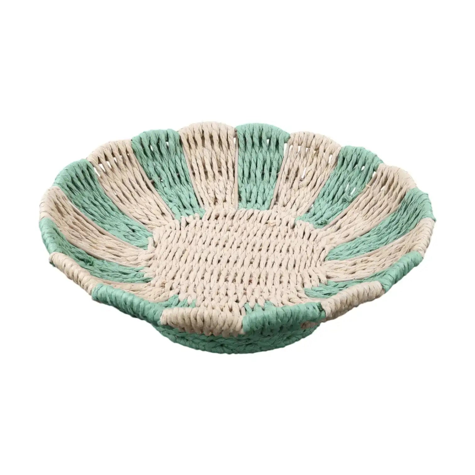 De afwisseling tussen natuurkleurige en groen geweven banen geeft de schaal een frisse, organische uitstraling. De ronde, licht golvende vorm doet denken aan een bloemkelk en zorgt voor een zachte, natuurlijke lijn in je interieur.