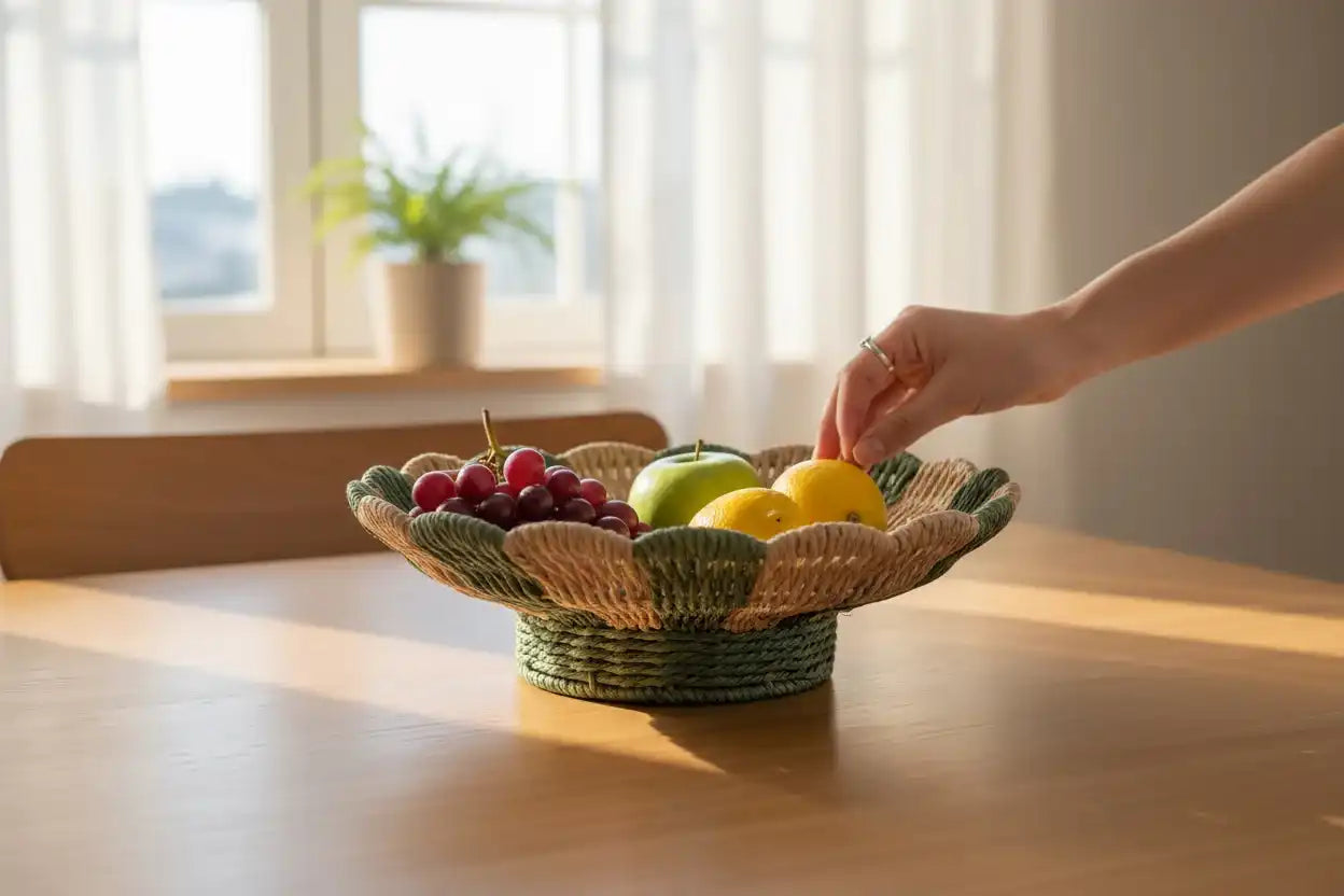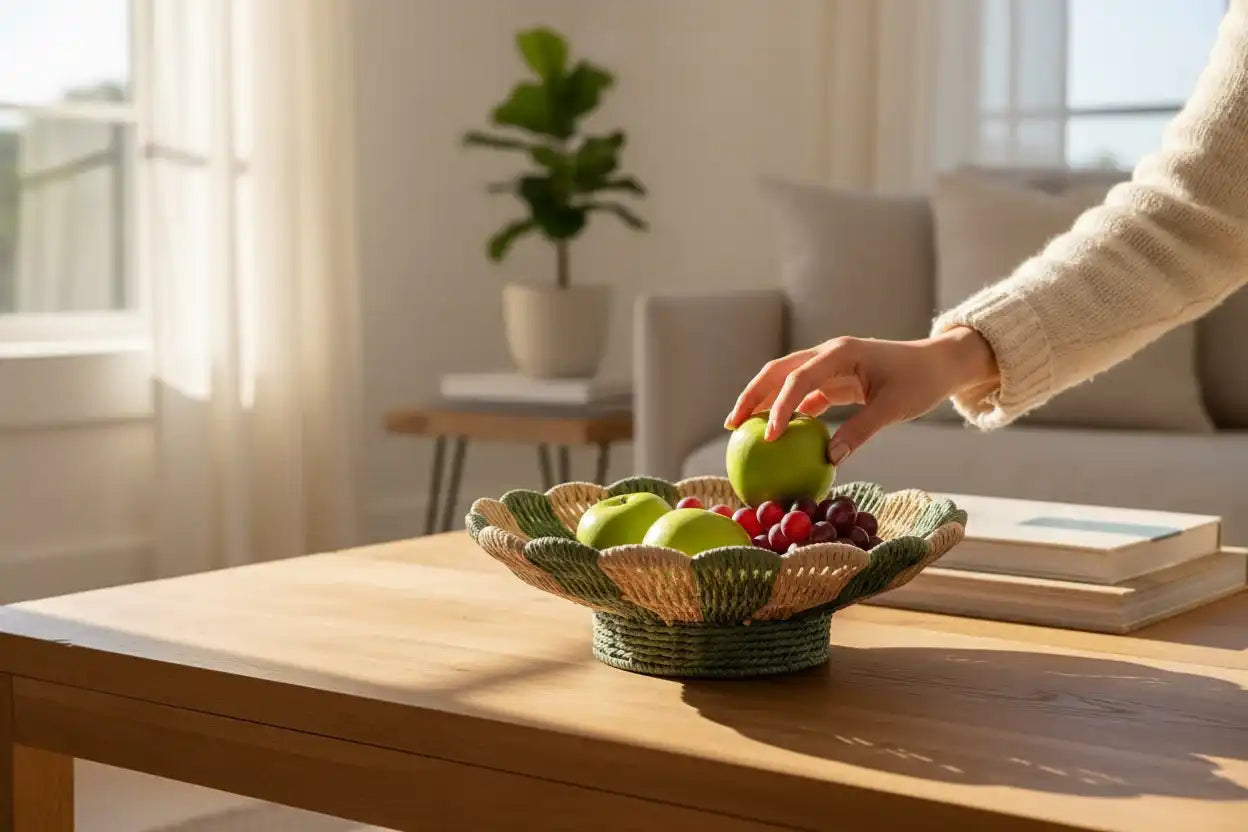 Gebruik haar als fruitschaal in de keuken, broodschaal op tafel of decoratief middelpunt op een dressoir. Door het ambachtelijke vlechtwerk is elke schaal uniek — met kleine variaties die haar karakter en charme benadrukken.
