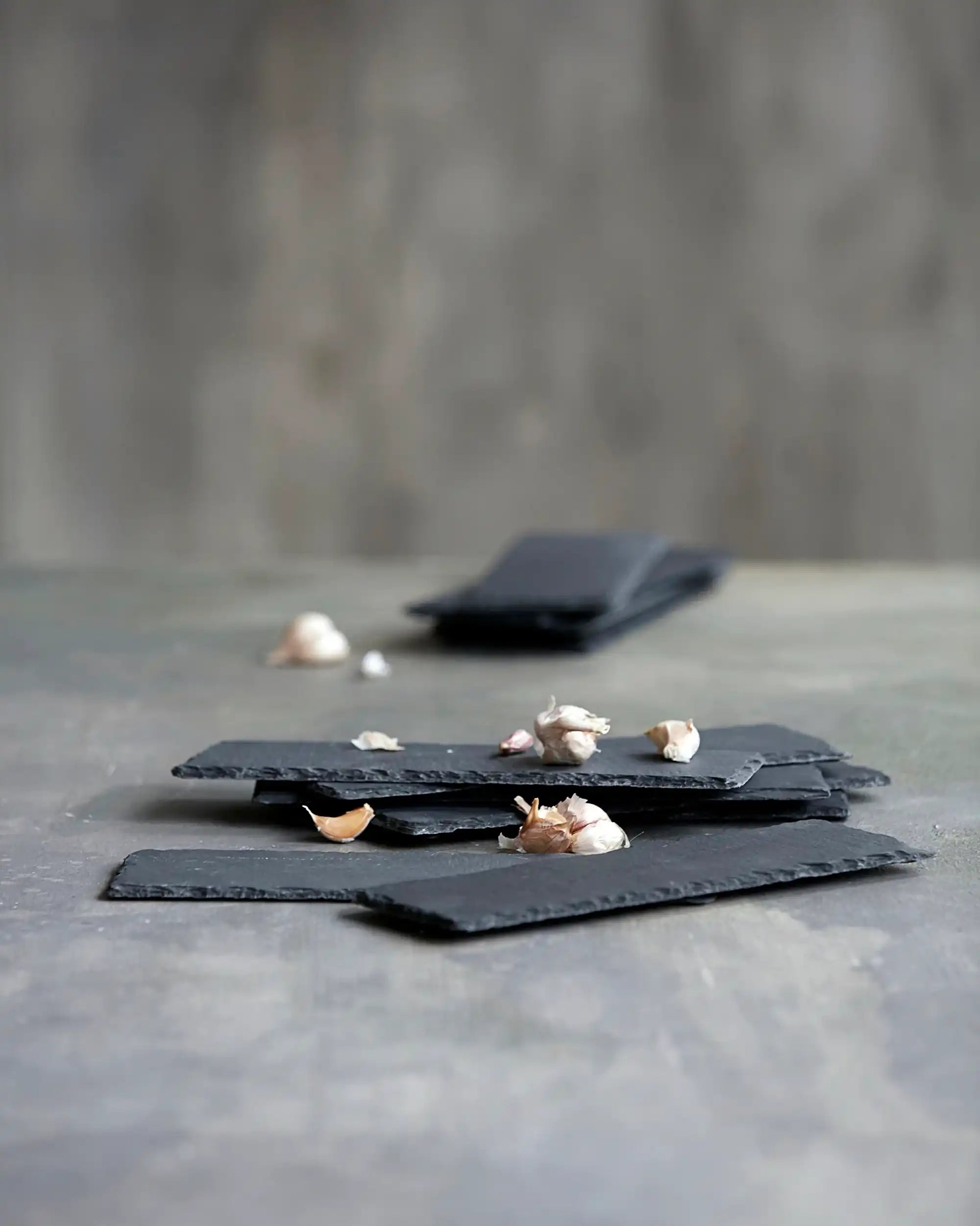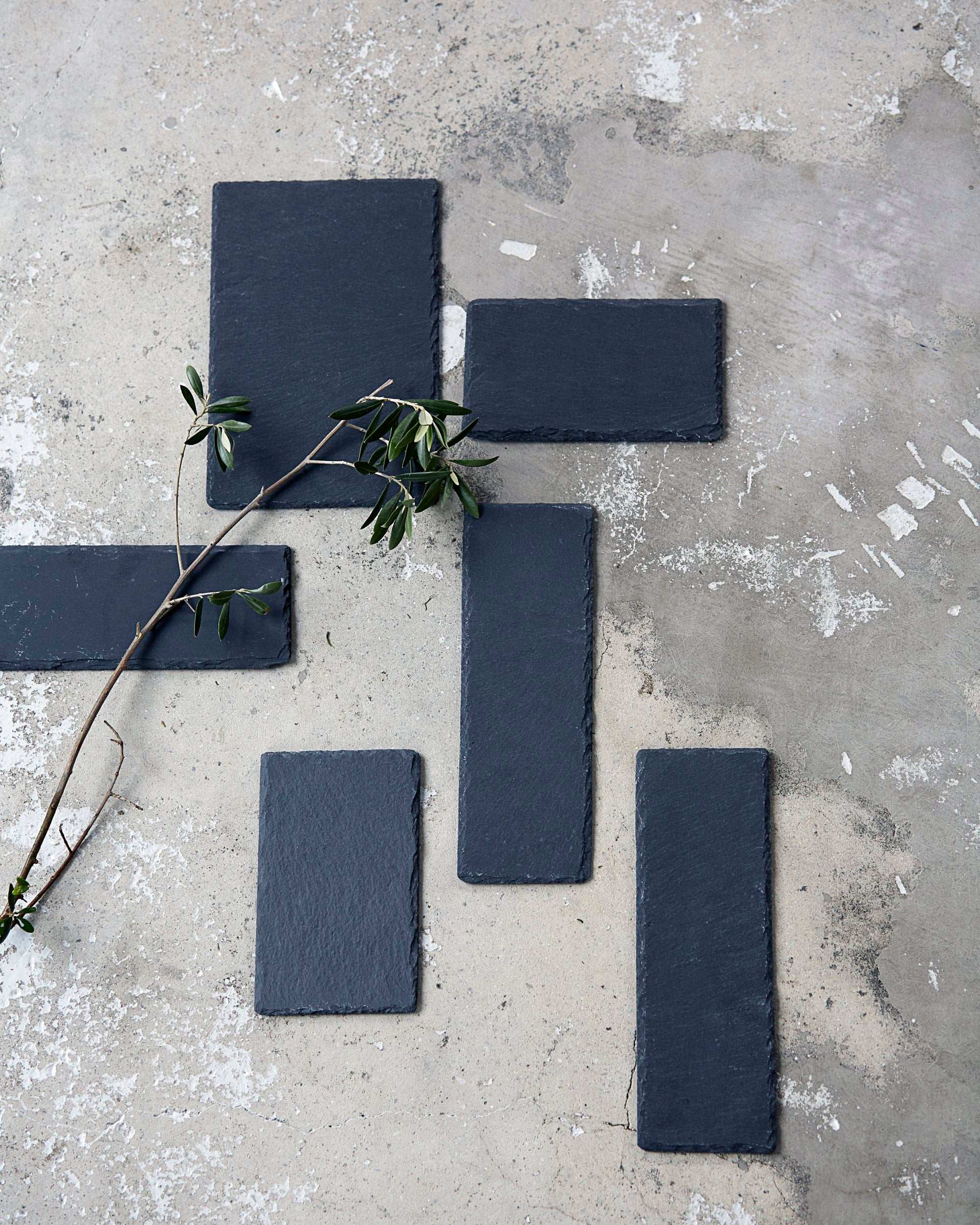 Rangschik drie gangen in mini-vorm op deze plank – een amuse, een zachte kaas en een klein zoet hapje – voor een verrassende manier van serveren. Combineer met servies in organische vormen om het contrast met het strakke leisteen te versterken.
