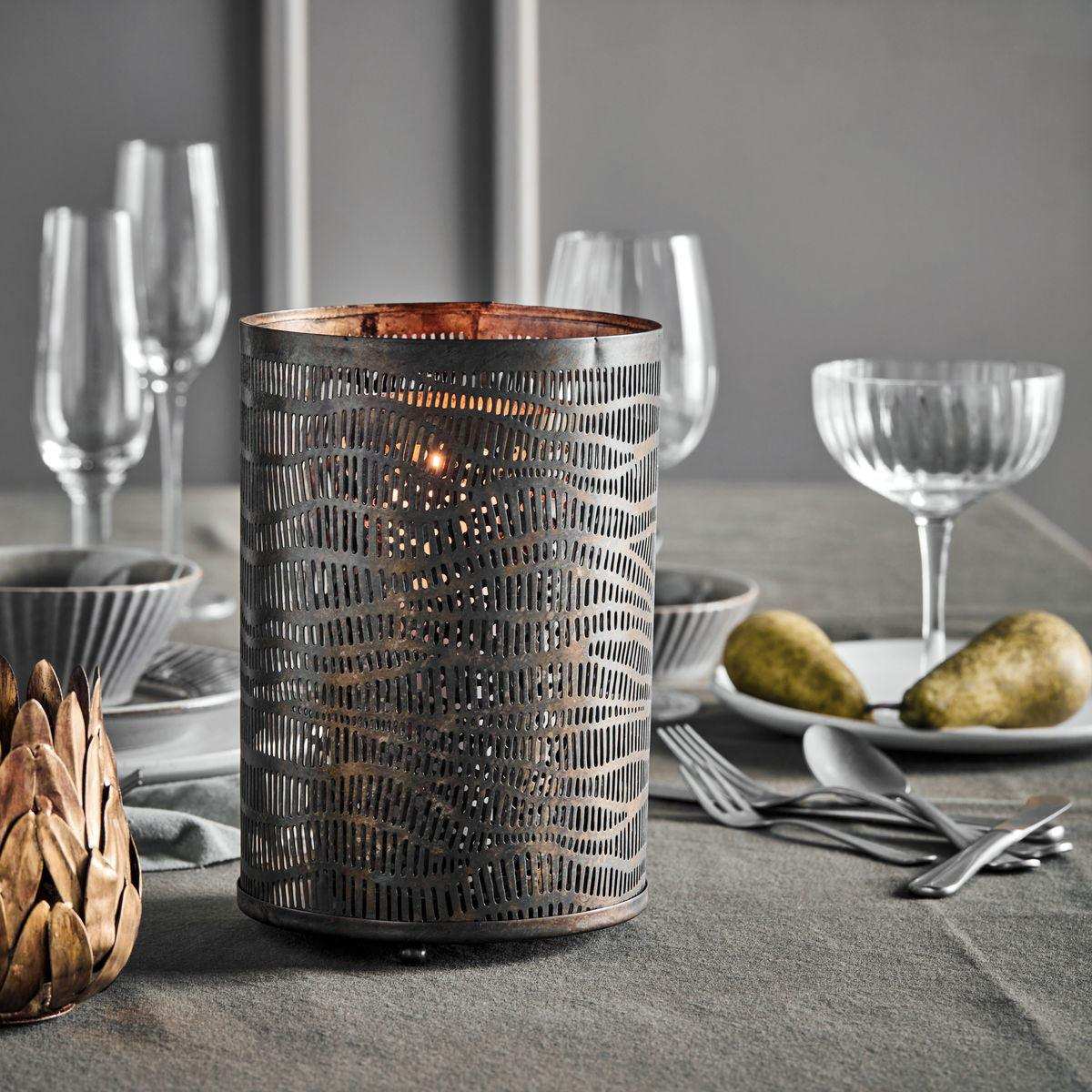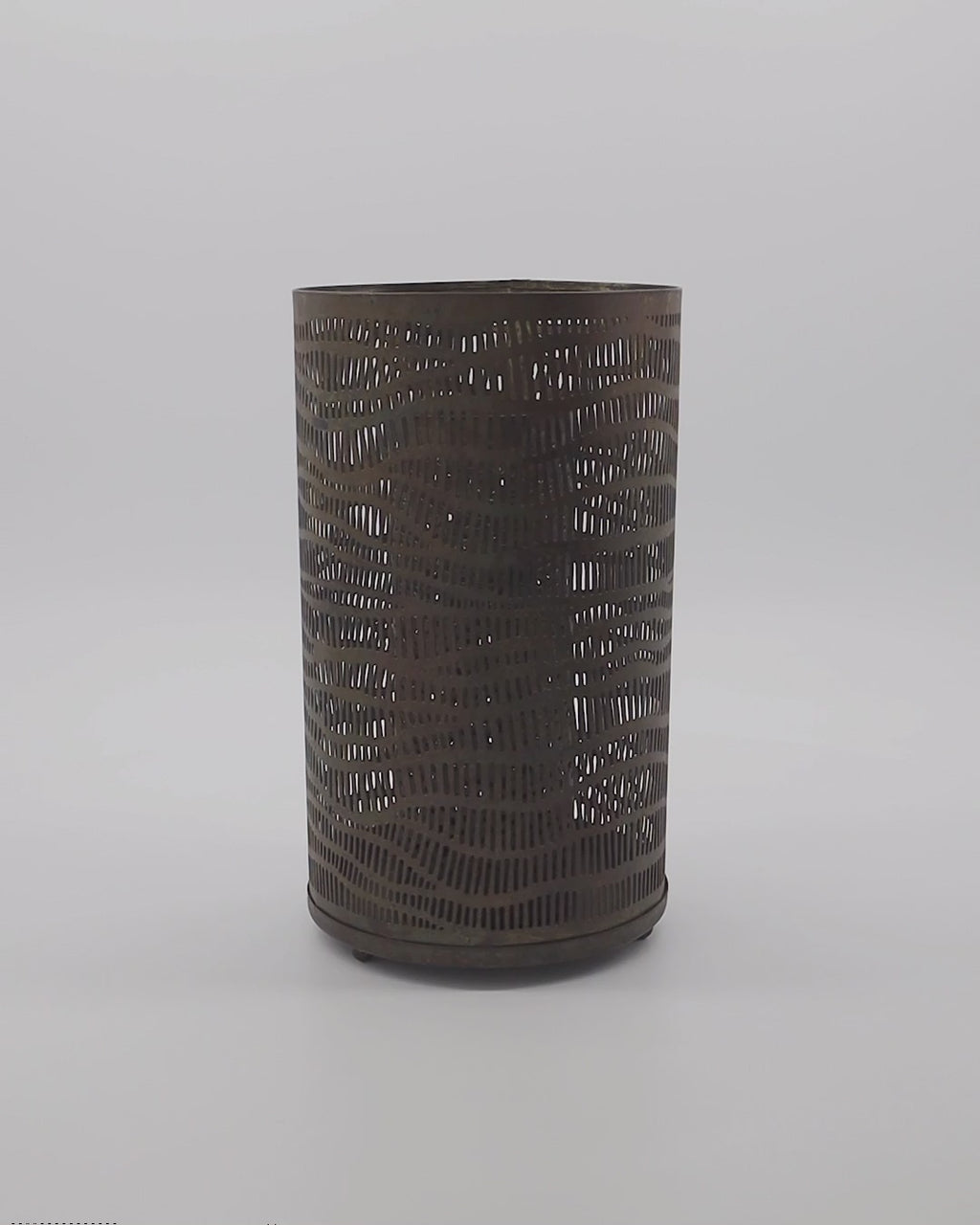 Met zijn hoogte van 22 cm en een doorsnede van 15 cm is dit sfeerlicht de perfecte aanvulling op je interieur. De antiekbruine afwerking geeft een vintage uitstraling, terwijl de handgemaakte details zorgen voor een uniek karakter. Het geperforeerde patroon verspreidt het kaarslicht op een subtiele en sfeervolle manier door de kamer, wat zorgt voor een ontspannen en knusse ambiance. Of je nu een diner bij kaarslicht organiseert of gewoon wilt ontspannen in een rustige omgeving, dit sfeerlicht voegt een vleugje elegantie toe aan elke gelegenheid.