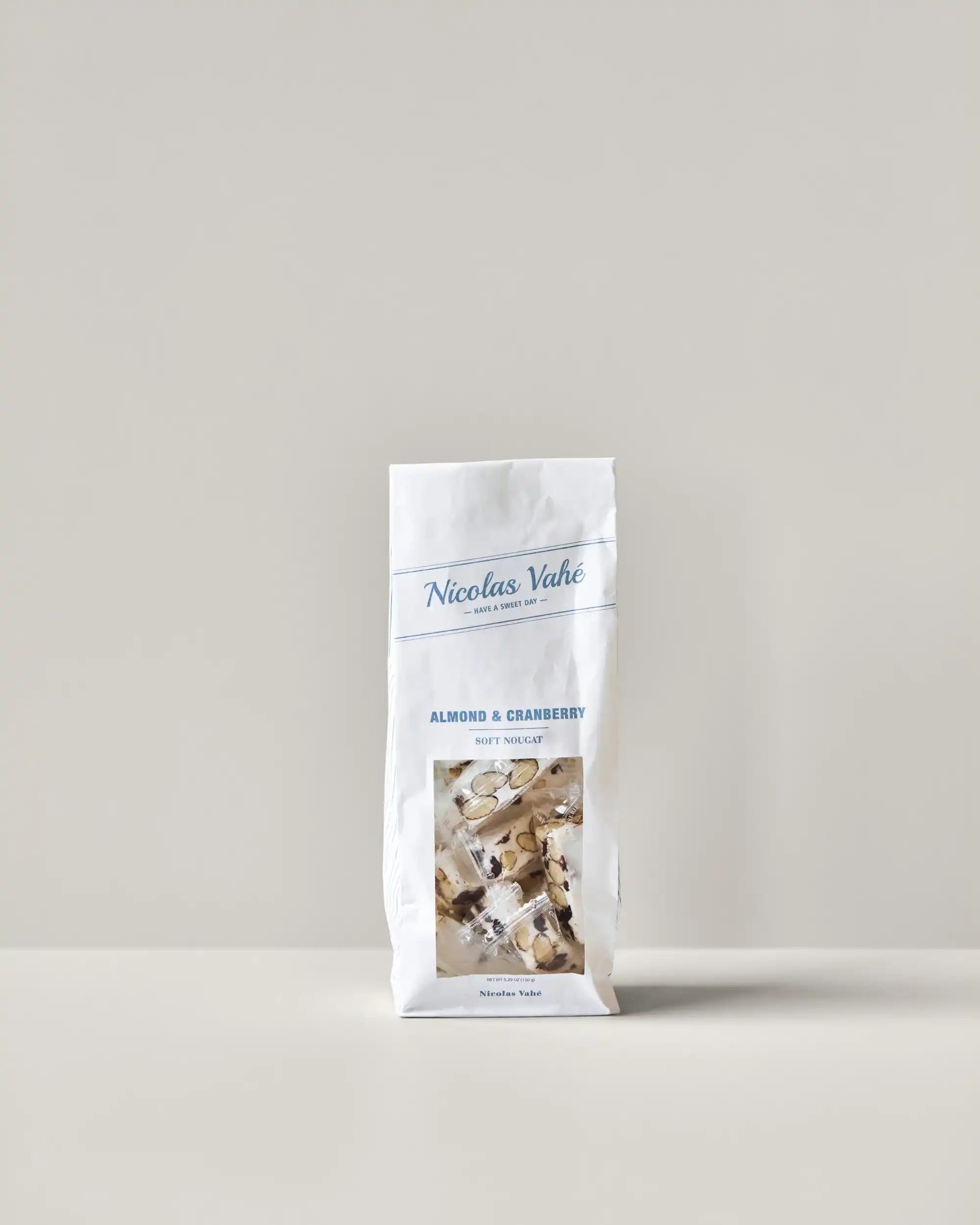 De nougat is rijk gevuld met 30% geroosterde amandelen en 16% cranberry’s, wat zorgt voor een volle textuur en een licht frisse smaak. De combinatie van een zachte, smeuïge basis met stevige noten en fruit geeft elke hap een mooi gebalanceerde bite. De verpakking heeft een formaat van 5 × 24 × 12 cm en is ideaal om te delen of om cadeau te geven.