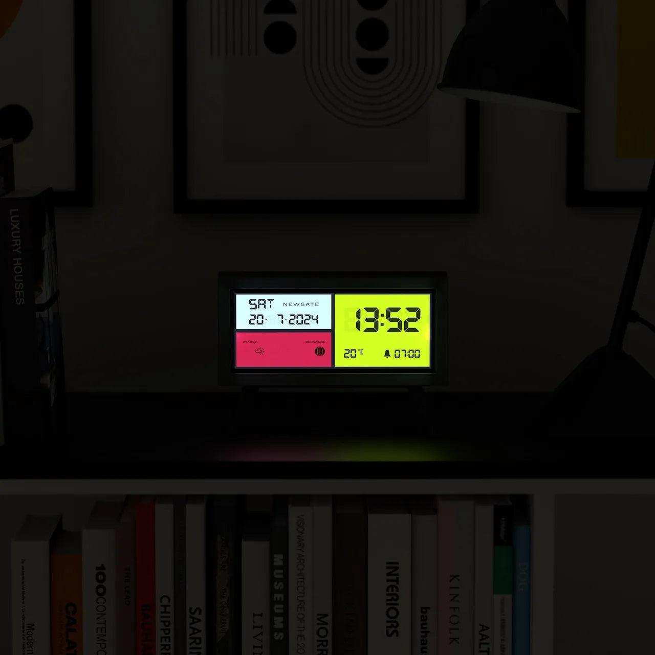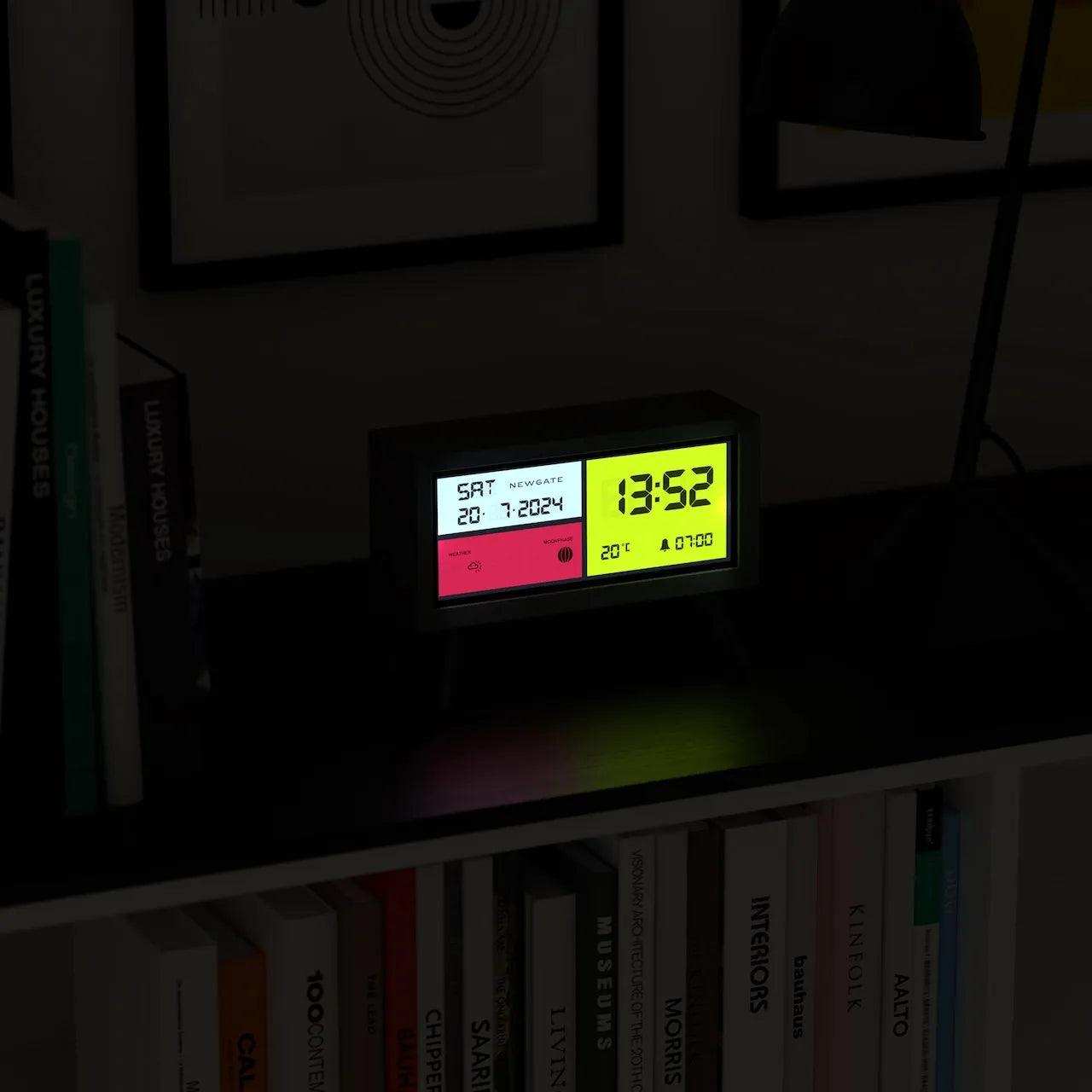 Wordt wakker en geniet van de de Newgate Spectronoma! Deze zwarte rechthoekige LCD-wekker is niet alleen een praktische toevoeging aan je nachtkastje, maar ook een stijlvolle toevoeging. Het veelzijdige scherm, in een elegant kleurenpalet van zwart, wit, rood en geel, maakt een krachtig visueel statement.