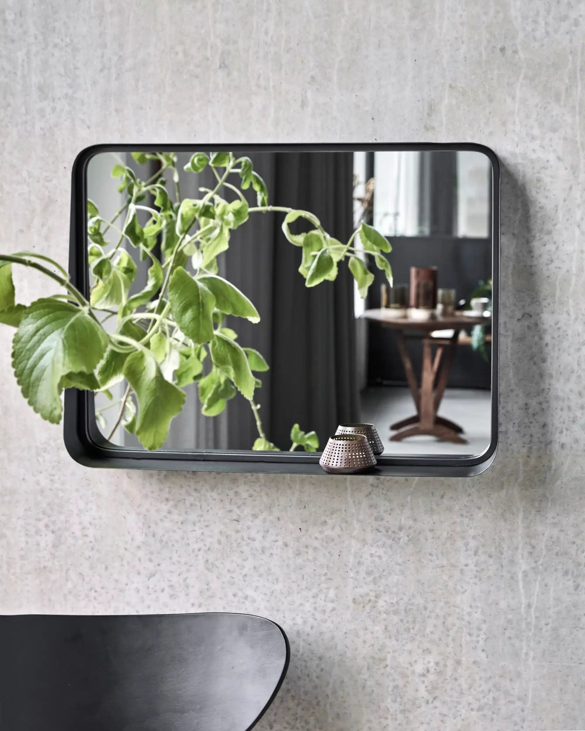 De zwarte lijst is gemaakt van staal met een antieke afwerking die elegant verouderd oogt, zonder zijn moderne karakter te verliezen. De spiegel heeft een breedte van 60 cm, een hoogte van 45 cm en komt 10 cm van de muur dankzij het geïntegreerde plankje. Deze glas-metalen combinatie maakt het geheel stevig en visueel in balans.