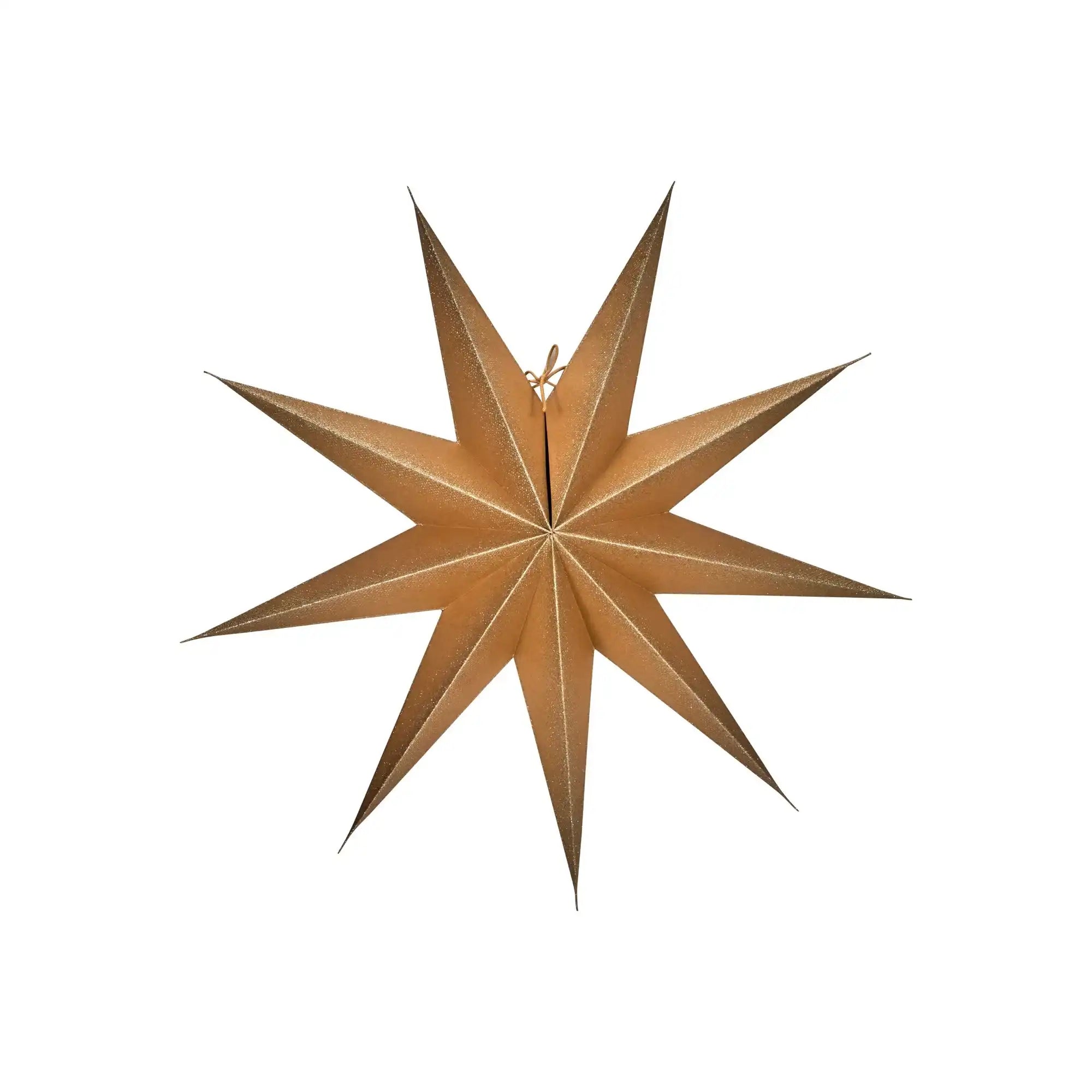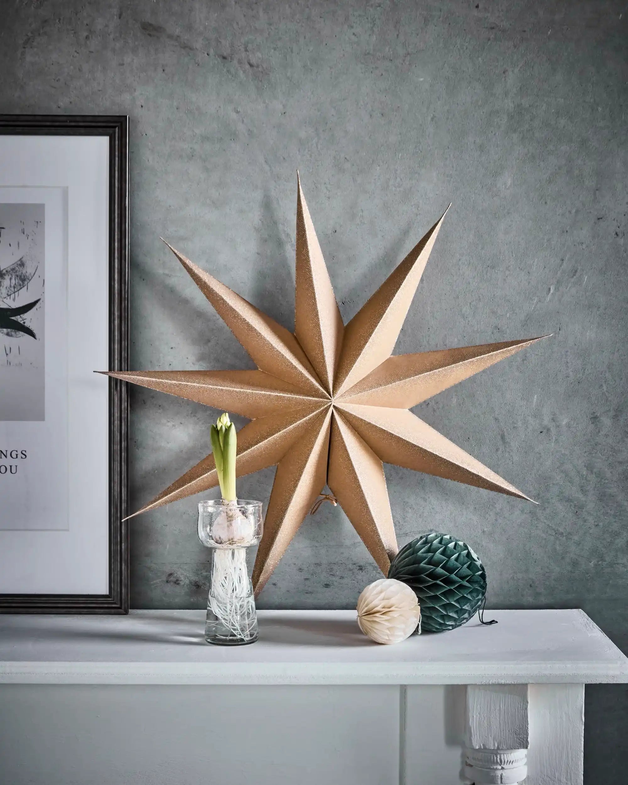 De ster is vervaardigd uit natuurlijk papier met een delicate glans. De champagnekleurige details zorgen voor een verfijnde uitstraling, zonder overdaad. Met een doorsnede van 60 cm en een breedte van 15 cm komt hij mooi tot zijn recht in zowel grote als kleinere ruimtes. Een lichte kunststof kern zorgt voor vormbehoud, zelfs bij herhaald gebruik.