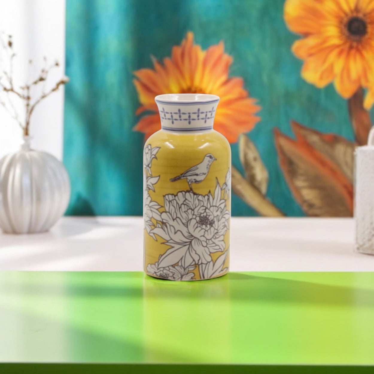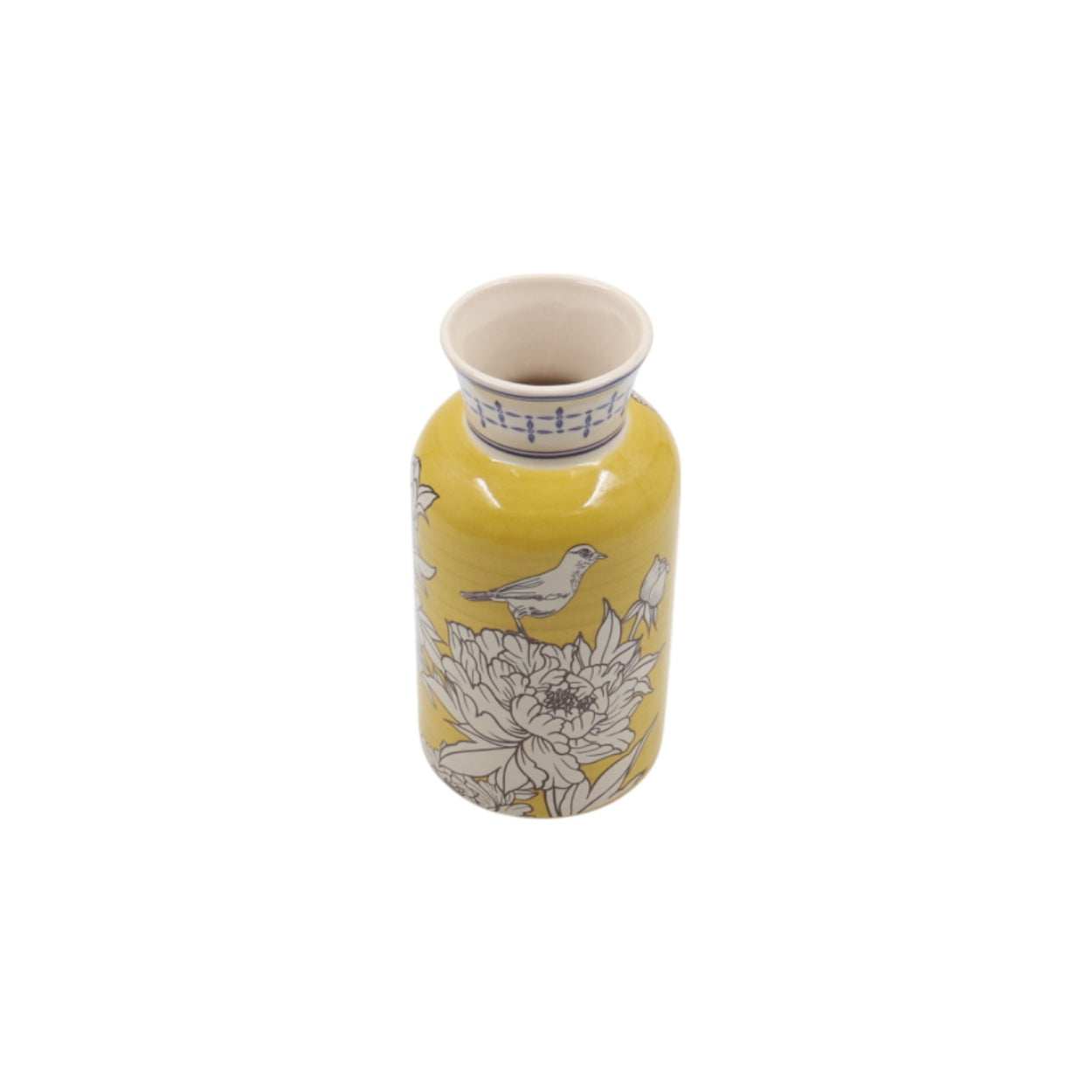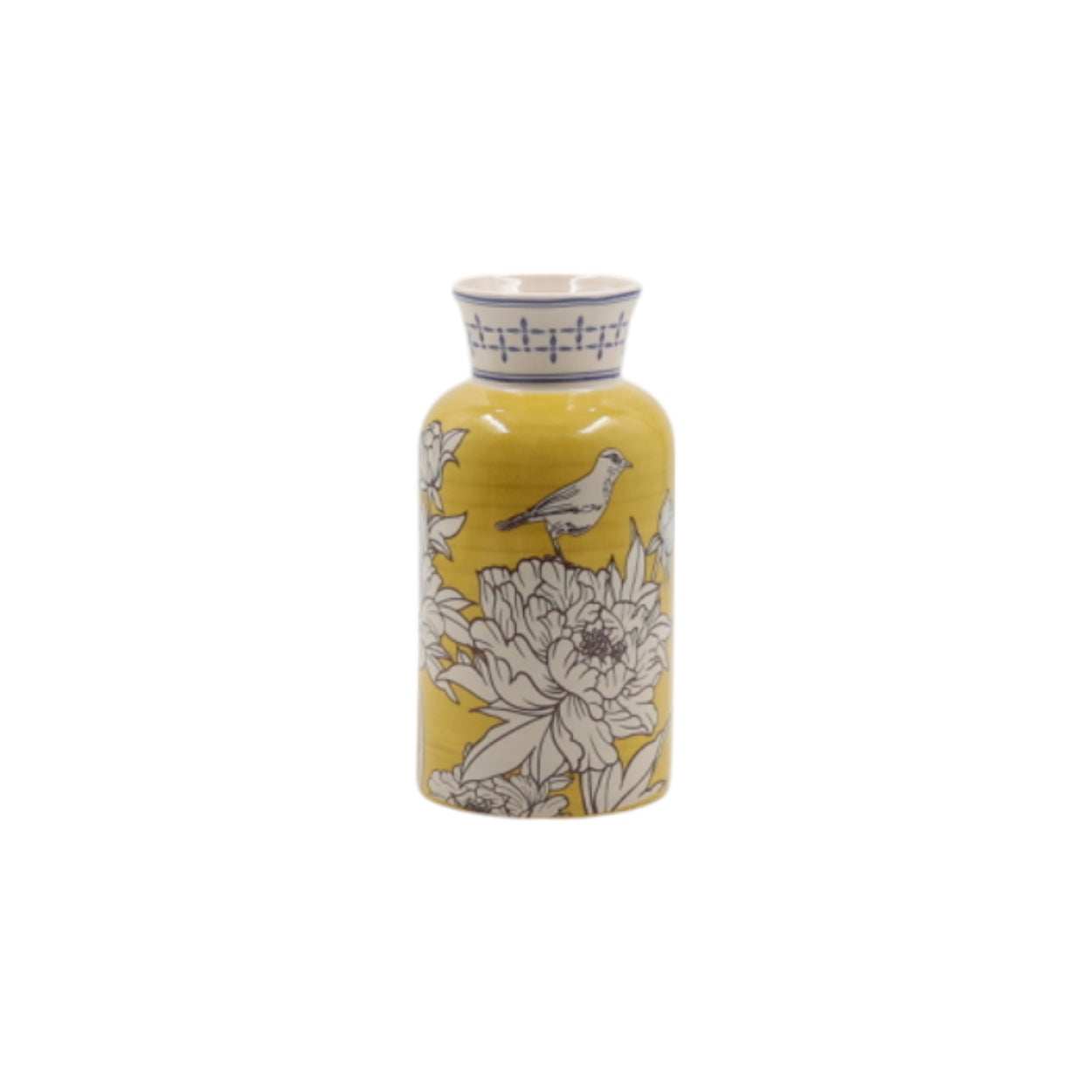 Laat je interieur stralen met de Sunshine Bloom vaas van Mansion. Deze keramieken eyecatcher combineert een zonnige, diepe gele glazuurlaag met een verfijnde bloemenprint in zwart-wit. Het resultaat? Een frisse, opvallende vaas die meteen sfeer toevoegt aan elke ruimte.