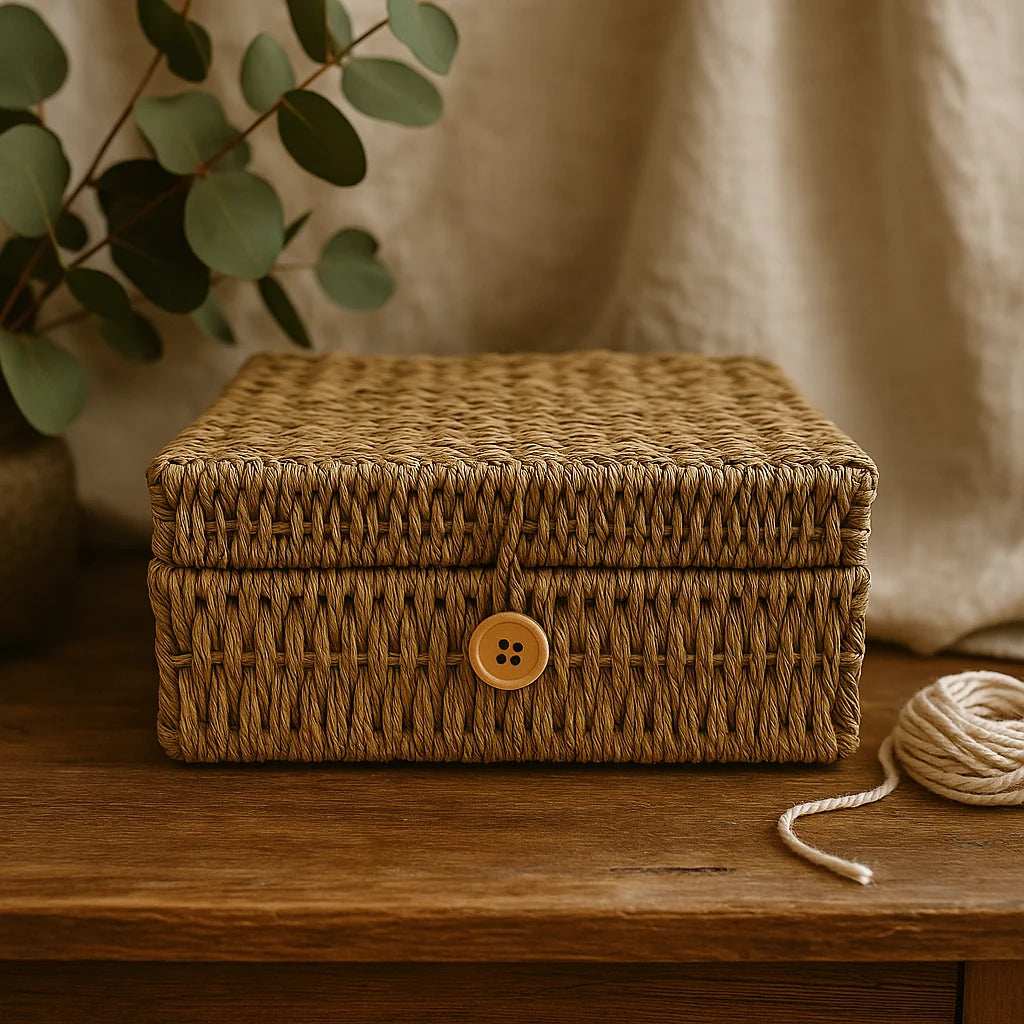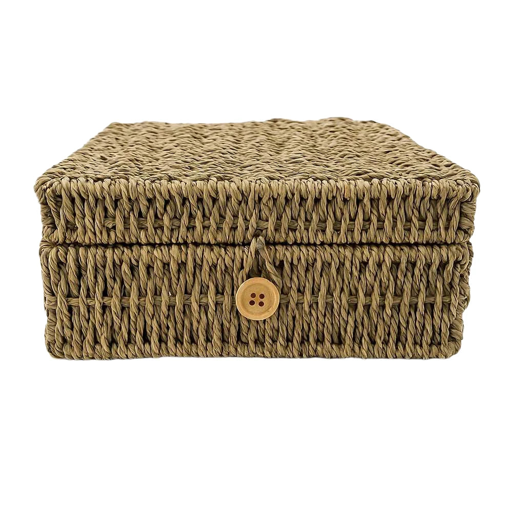 Met 6 aparte vakken biedt deze doos overzicht en ruimte voor je favoriete theesoorten – van groene thee tot kruideninfusie. De handige deksel met knoopsluiting houdt alles netjes afgesloten, terwijl de natuurlijke textuur zorgt voor een gezellige sfeer op je aanrecht of tafel.