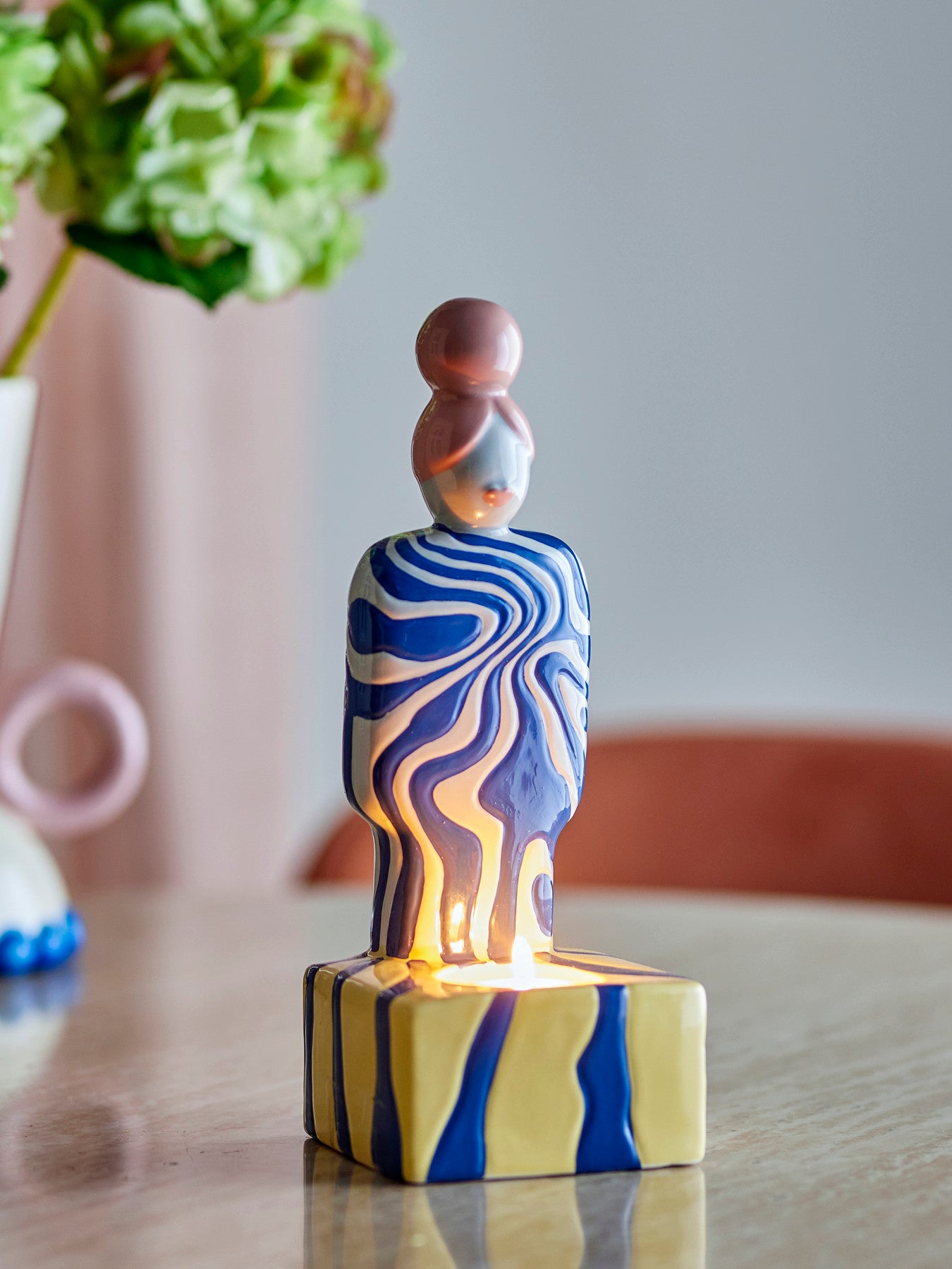 Gebruikstip: Plaats hem solo als rustig accent of combineer met andere aardewerken objecten in blauw- of neutrale tinten voor een harmonieuze compositie. Laat het kaarslicht ’s avonds tot zijn recht komen in een hoek waar je ontspant, bijvoorbeeld naast je favoriete leesstoel. Zo creëer je met weinig moeite een moment van stilte in huis, een subtiele toevoeging waar je dagelijks plezier van hebt.