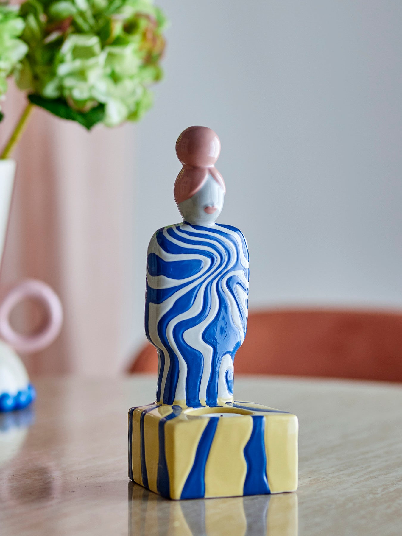 Details & materiaal: De houder is gemaakt van aardewerk en uitgevoerd in multi-kleur: blauw op een zachte ondergrond, rustend op een gele basis. Dat materiaal voelt solide aan en laat het ambacht mooi spreken. Met b × h × d 9 × 25 × 10 cm voegt hij hoogte toe zonder veel ruimte te vragen, ideaal op een vensterbank, dressoir of boekenplank. Handgeschilderde details zorgen voor een verzorgde afwerking; kleine variaties in patroon en kleurintensiteit kunnen voorkomen, wat elk exemplaar net even anders en daarmee persoonlijk maakt.