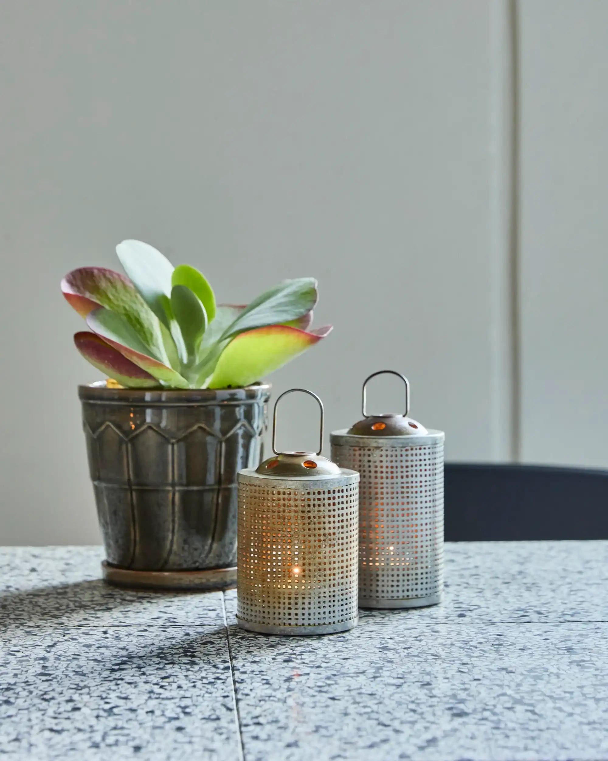 Warmte en sfeer smaenbrengen: dat doe je moeiteloos met de Meta theelichthouders. Deze set van twee verspreidt een subtiel spel van licht en schaduw dat direct een intieme ambiance creëert – ideaal voor rustige avonden of tijdens etentjes met vrienden. Het geperforeerde patroon geeft ze een stoere, verfijnde uitstraling.