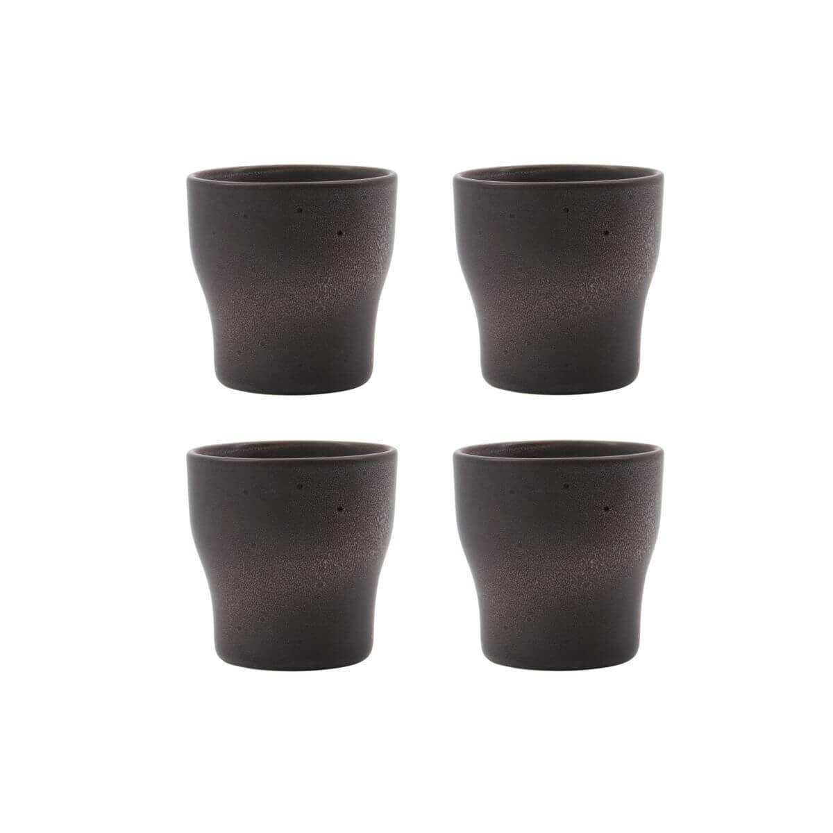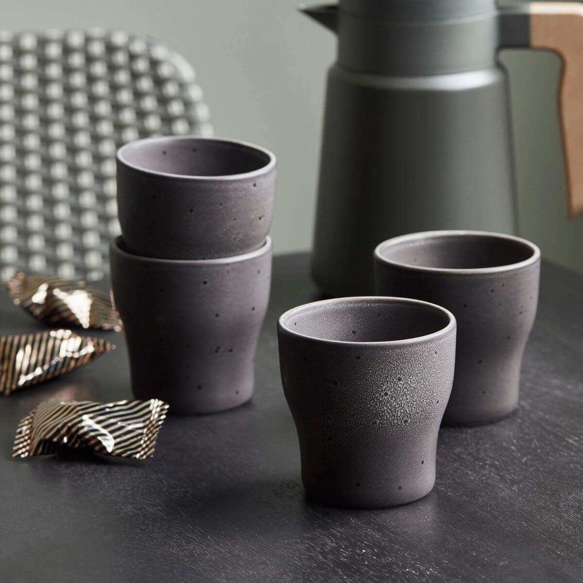 De Liss mokken zijn vervaardigd uit hoogwaardig aardewerk en hebben een aantrekkelijke donkergrijze glazuurafwerking. Tonale stippen zijn speels verspreid over de oppervlakte, waarbij ze subtiel glanzen wanneer het licht erop valt. Dit zorgt voor een charmant visueel effect dat je gasten zeker zal imponeren.