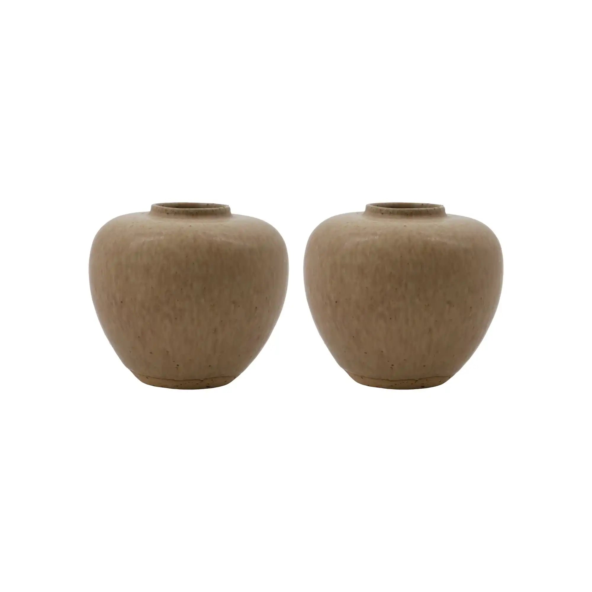 Elke vaas uit deze set is gemaakt van stevig aardewerk met een gespikkelde lichtgrijze glazuurlaag. Dit zorgt voor een serene uitstraling met een tastbare, natuurlijke afwerking. De grootste vaas heeft een hoogte van 9 cm en een diameter van 9,5 cm – perfect voor op een plank, bijzettafel of dressoir.