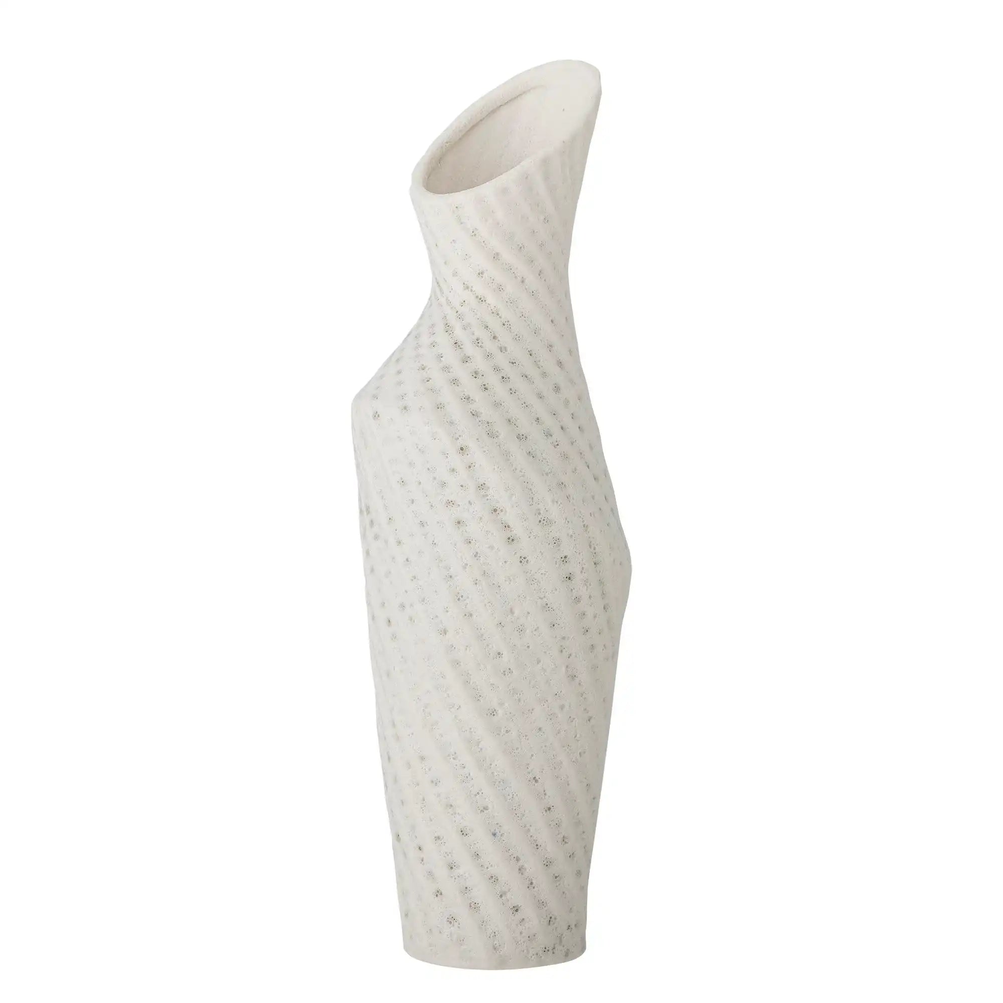 Details & materiaal: Fikla is uitgevoerd in duurzaam aardewerk met een voelbare textuur, afgewerkt in tijdloos wit. Met ø 9 cm is de vaas slank en elegant, perfect voor eenvoudige arrangementen of enkele ranke stelen. De organische, gedraaide lijnen zorgen vanuit elke hoek voor een andere aanblik, wat subtiele dynamiek in je interieur brengt. Het minimalistische ontwerp houdt de sfeer luchtig en ingetogen, zodat je gemakkelijk combineert met andere materialen en kleuren.