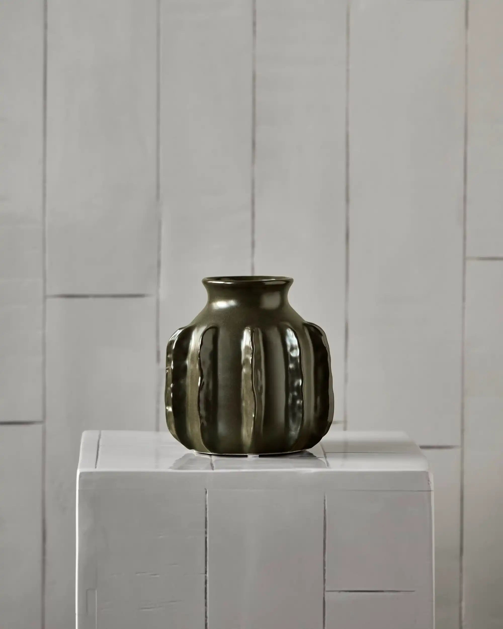 Met een hoogte van 15 cm is deze vaas perfect voor een opvallende plek op je eettafel, dressoir of vensterbank. Gebruik de vaas als stijlvol pronkstuk op zichzelf, of vul hem met je favoriete verse bloemen en droogtakken voor een persoonlijk accent. De rijke donkergroene glans maakt van iedere plek in huis een sfeervol geheel.