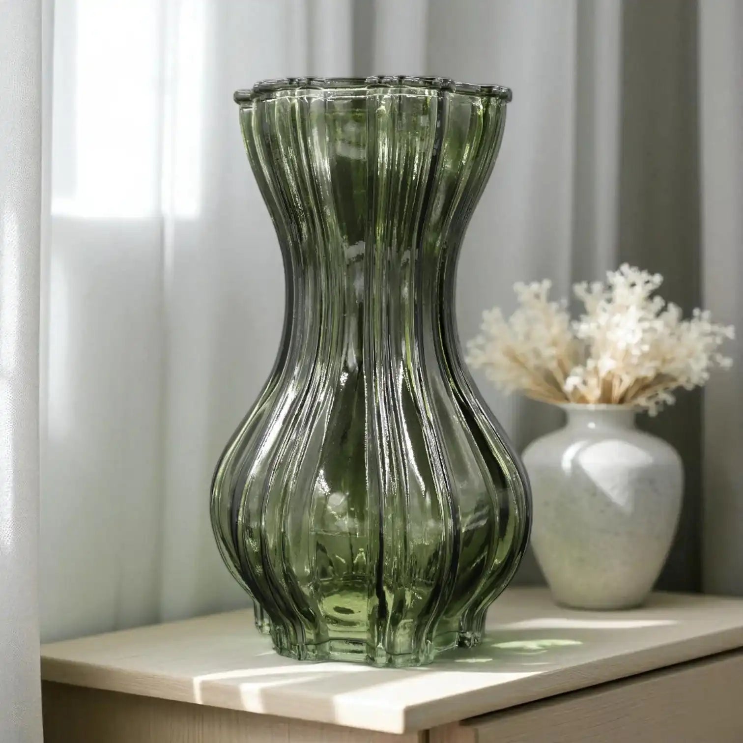 Decoratietip: Combineer de Vlin Fion vaas met andere groene of amberkleurige glazen accessoires voor een warme, natuurlijke sfeer in huis.