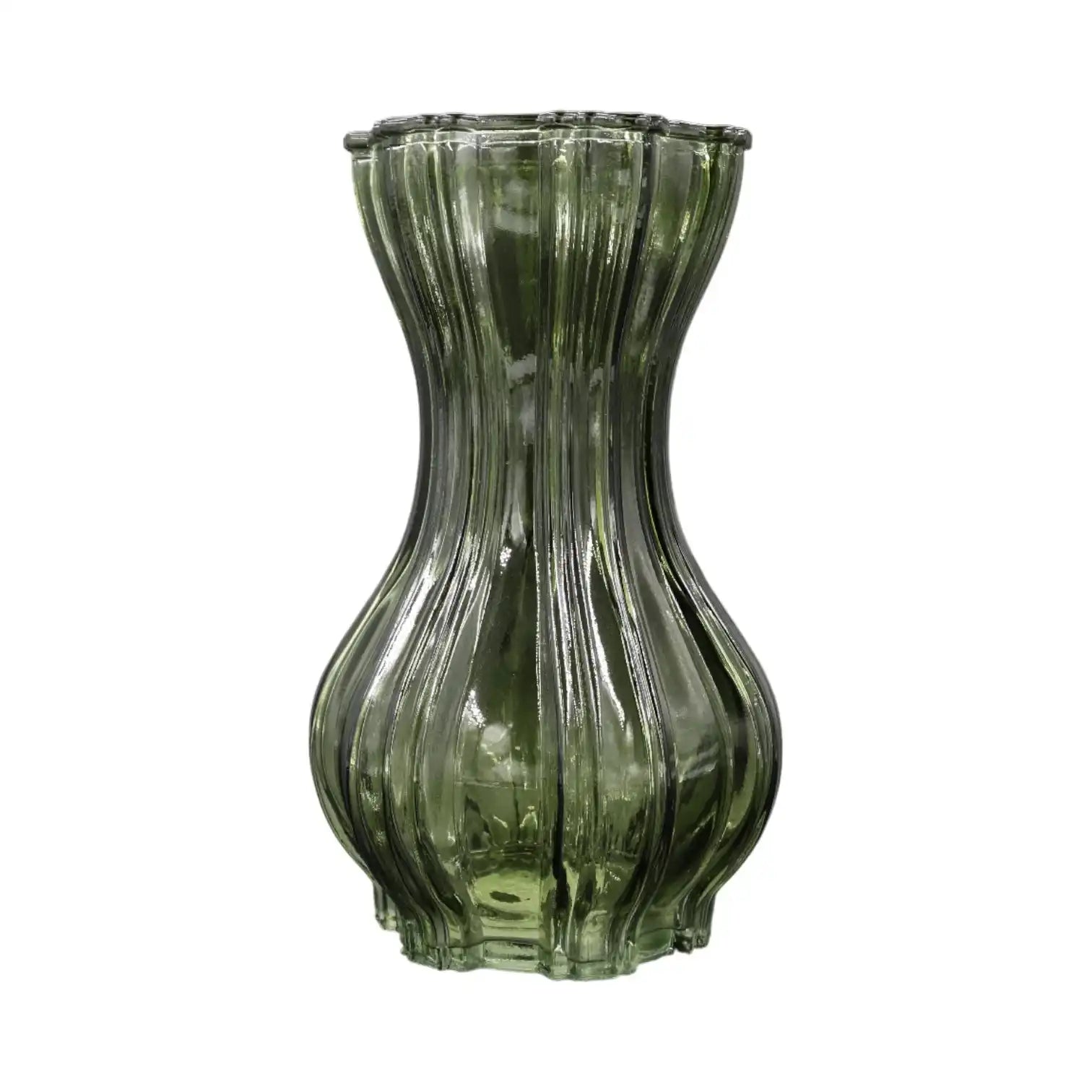 De Vaas Flin Fion groen is een elegante toevoeging aan elk interieur. Dankzij de organische vorm en het diepe, antiek groene glas brengt deze vaas een vleugje rust en natuur in huis. De subtiele ribbelstructuur in het glas zorgt voor een speels lichtspel zodra er zonlicht op valt.