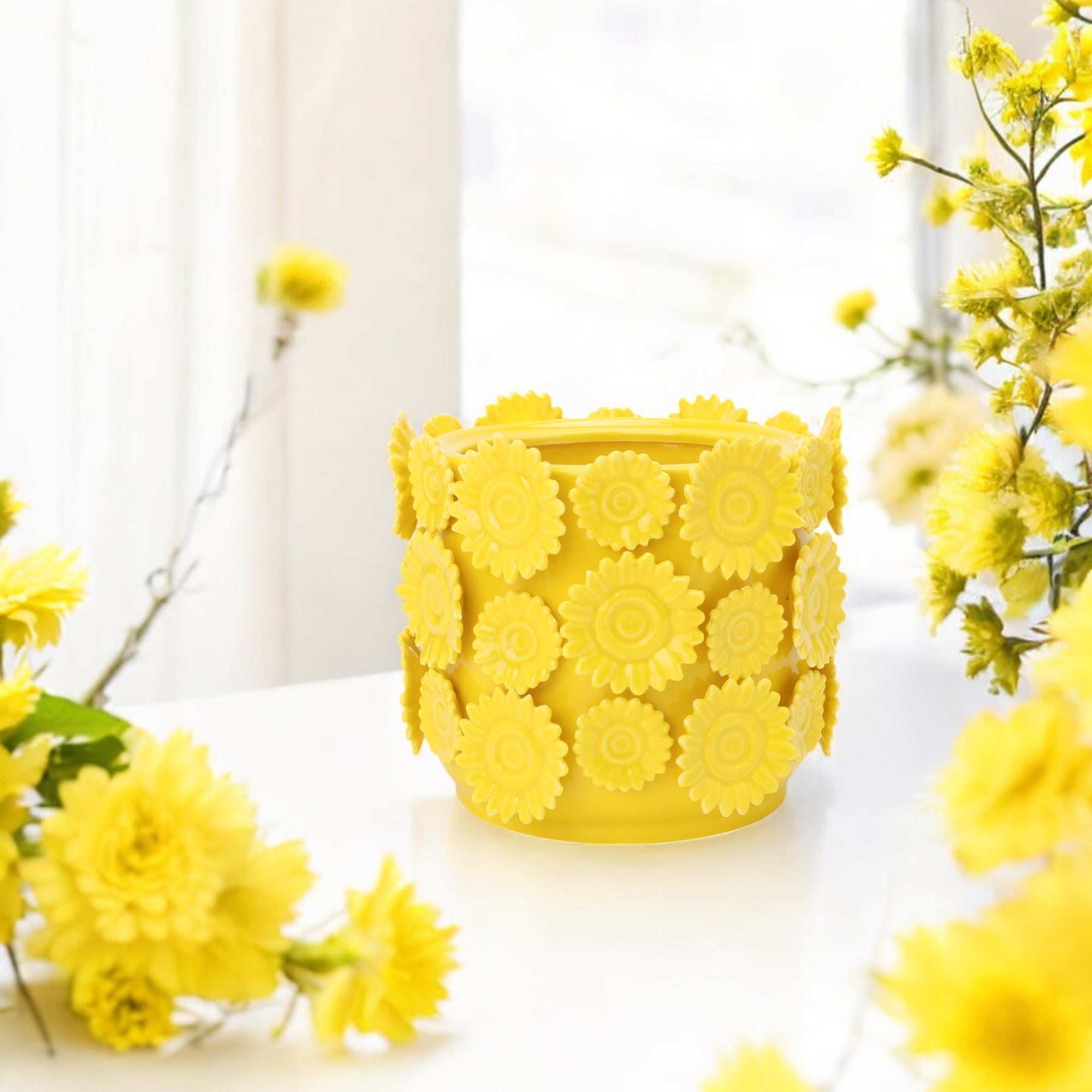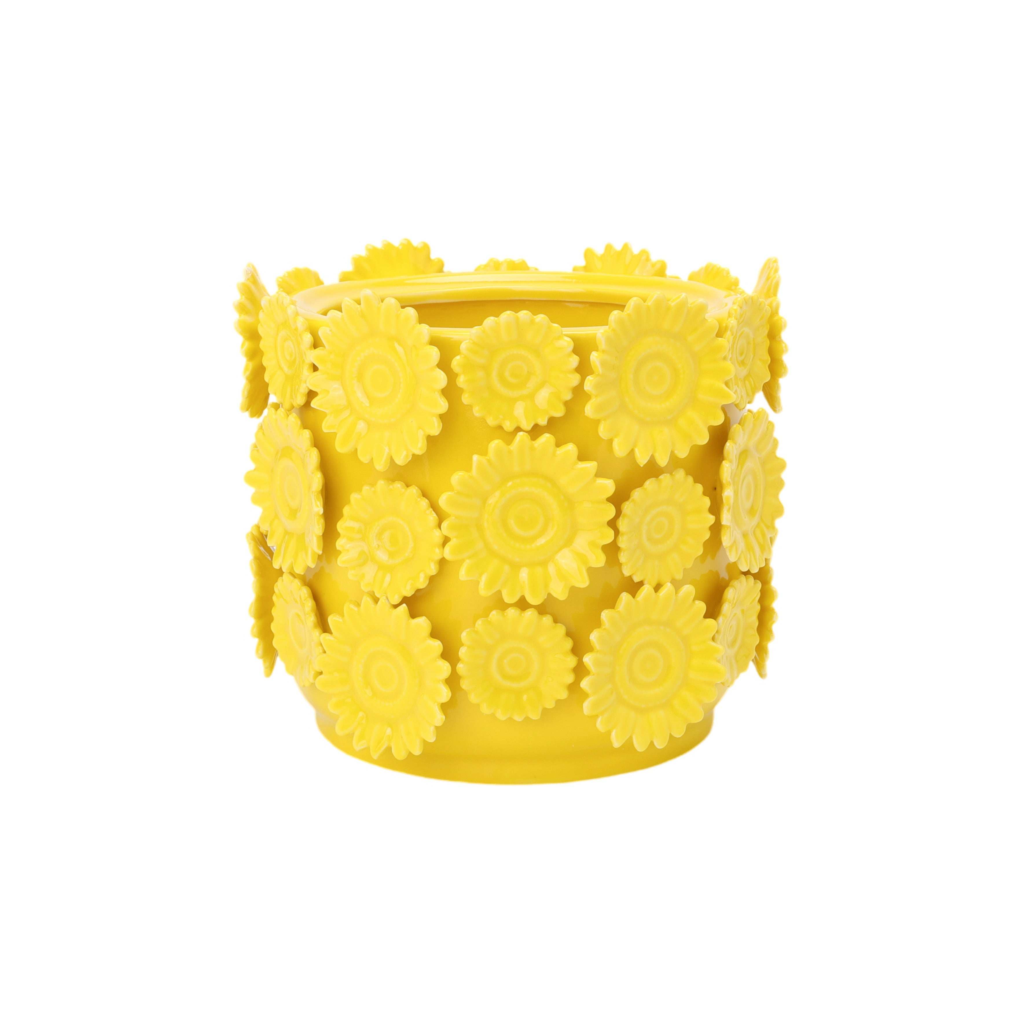 Gemaakt van glanzend geel aardewerk straalt deze vaas positiviteit en warmte uit. Met een buitenmaat van 17 cm en een hoogte van 14 cm is hij compact, maar allesbehalve saai. Let op: door de dikke wand en de zonnebloemdecoratie is de binnenmaat een stuk kleiner dan de buitenmaat, waardoor de vaas vooral geschikt is voor een klein boeket of een paar losse bloemen.