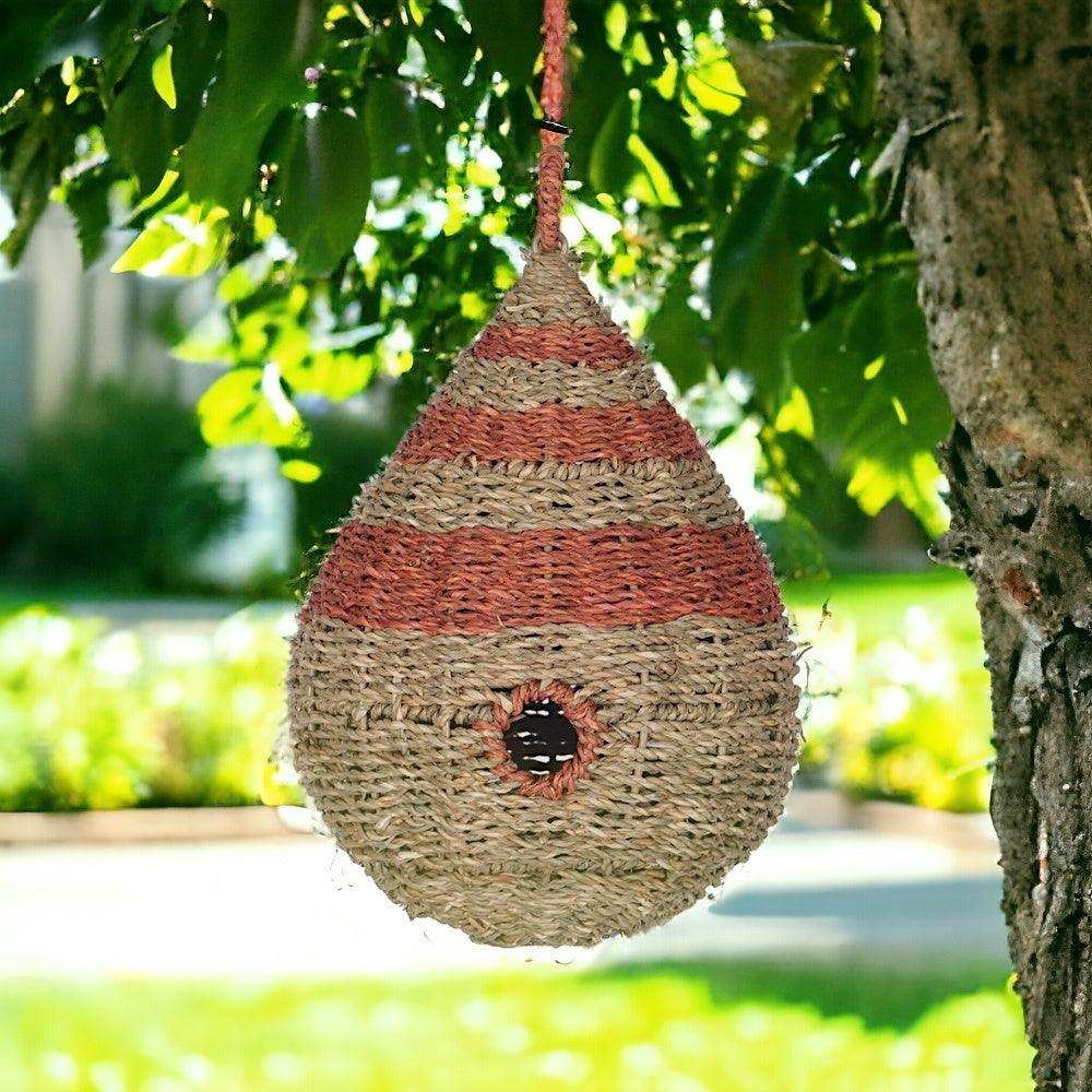 Het charmante vogelhuisje 'Omas rood' van House of Nature, een lieflijk toevluchtsoord voor onze gevederde vrienden. Dit unieke vogelhuisje, met zijn natuurlijke bruine kleur versierd met vrolijke rode horizontale strepen, hangt sierlijk in je tuin aan een stevig touwtje. Gemaakt van natuurlijke materialen zoals gras, is het niet alleen een veilige haven voor vogels, maar ook een milieubewuste keuze voor jou. Met een hoogte van 27cm en een doorsnede van 20cm, creëert dit vogelhuisje een warm welkom in je tuin. Combineer verschillende vogelhuisjes met rode en gele strepen voor een levendig en harmonieus geheel.