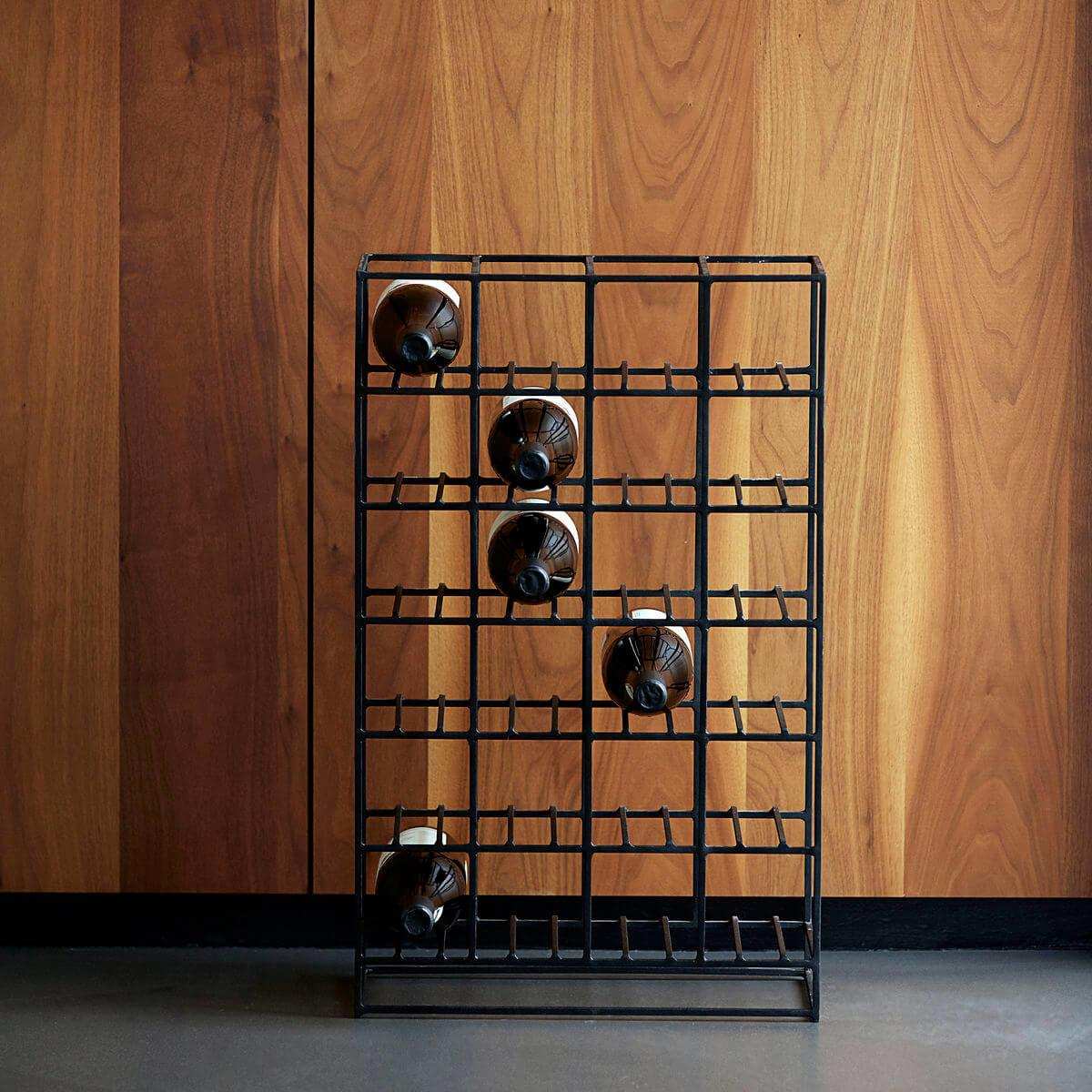 Het wijnrek is gemaakt van zwart ijzer, waardoor het een stoere en eigentijdse uitstraling heeft. Het strakke ontwerp en de grafische vormen voegen een vleugje moderniteit toe aan je interieur, terwijl het tegelijkertijd een praktische oplossing biedt voor het opbergen van je favoriete wijnen.